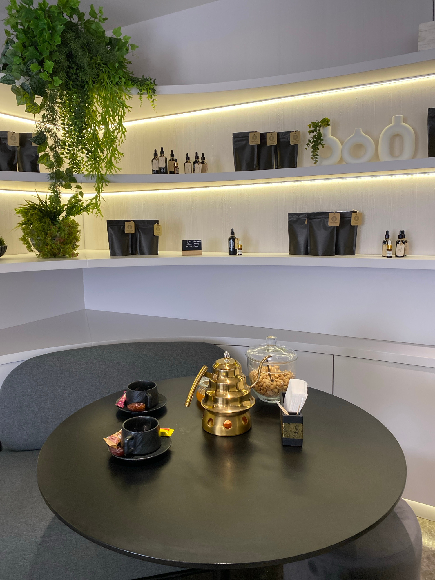 The image shows a modern interior, potentially a shop or café, though no people are visible. A brightly lit shelving unit displays various products, including what appear to be packages of dried goods…read more