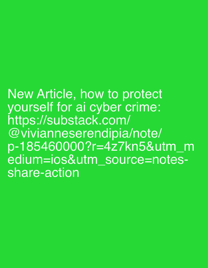 The image contains text on a green background. The text announces a new article on how to protect oneself from AI cybercrime. It provides a link to the article on Substack, specifically at "@viviannes…read more