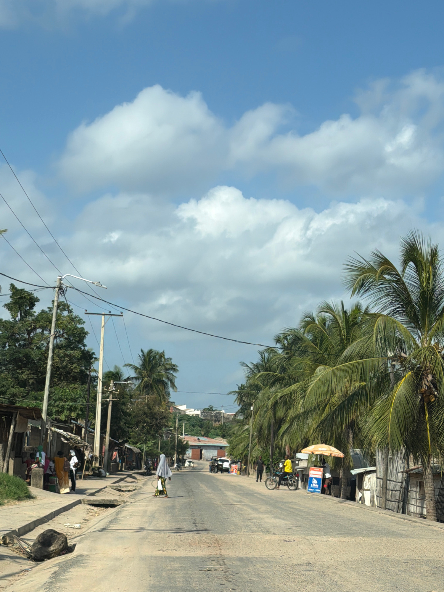 The image captures a street scene in Pemba, Mozambique. The street is flanked by palm trees and utility poles, with a partly cloudy sky overhead. Along the roadside, there are informal businesses and…read more