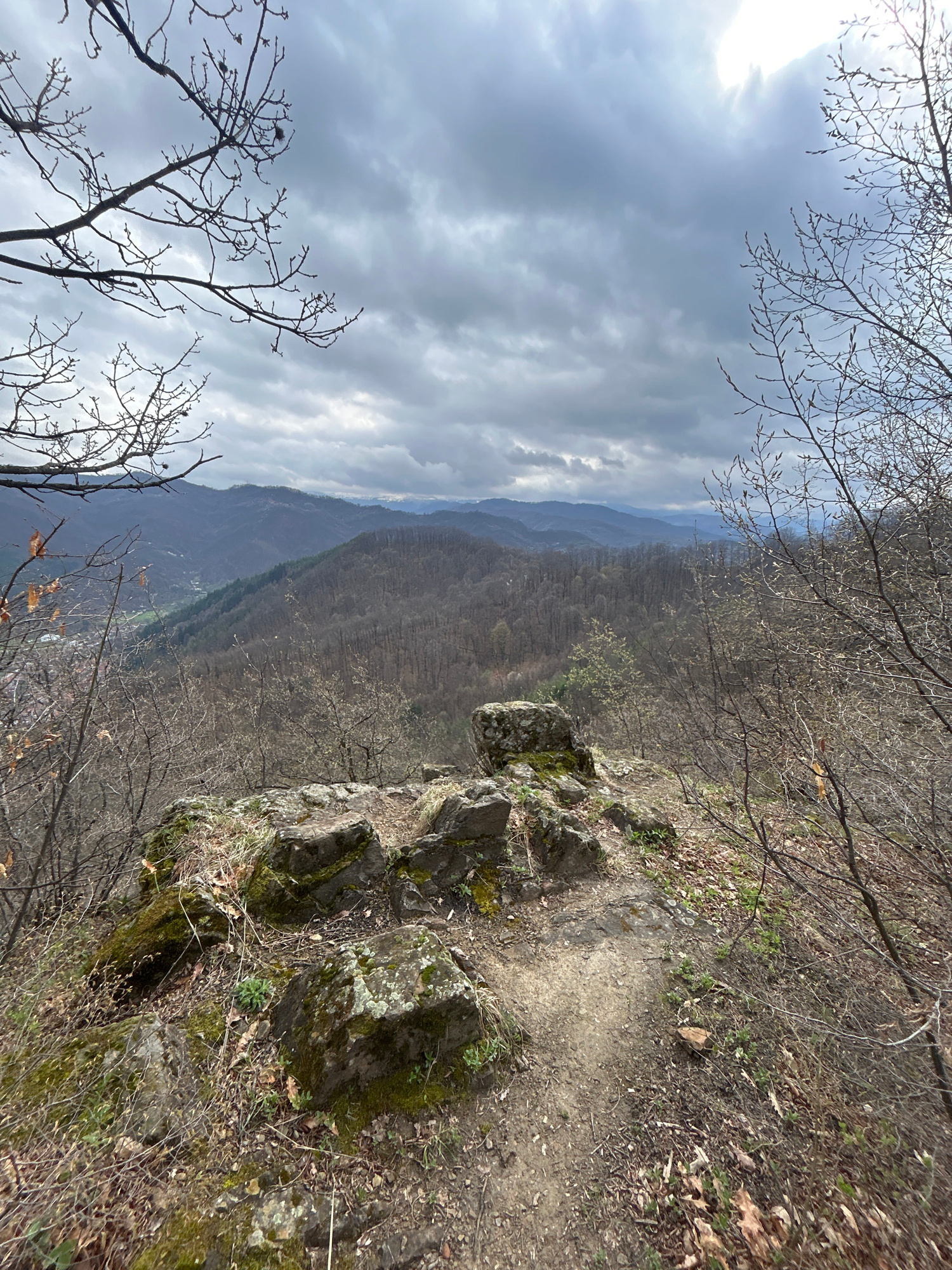 The image depicts a view from a high, rocky outcrop, likely a cliff edge, in what appears to be a mountainous, wooded region. The sky is overcast with patchy clouds. The foreground shows rocks covered…read more