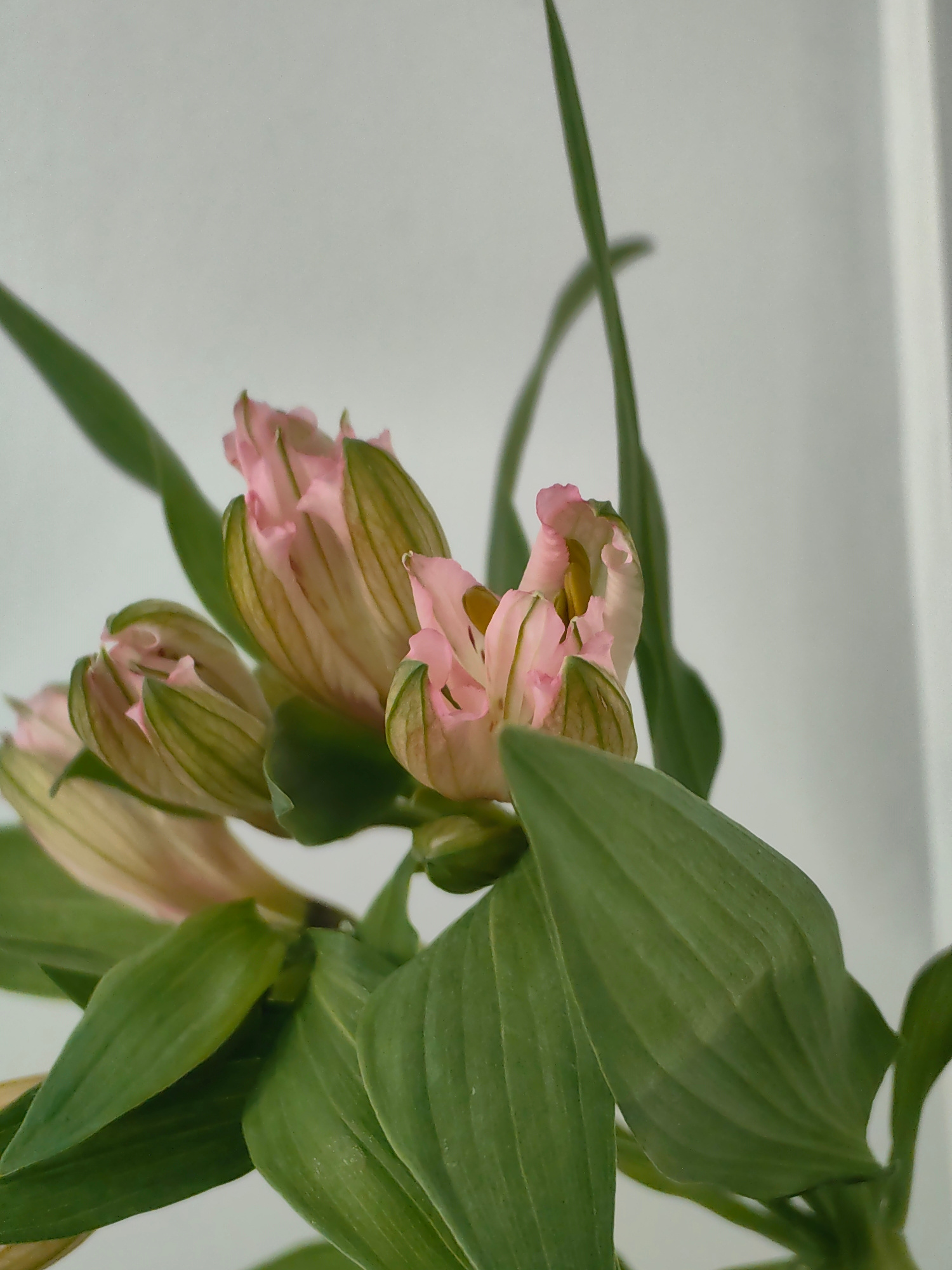 This media file presents a close-up, vertical shot of a plant featuring several developing flower buds and lush green leaves. The primary subjects are a cluster of pink flower buds, possibly Alstroeme…read more