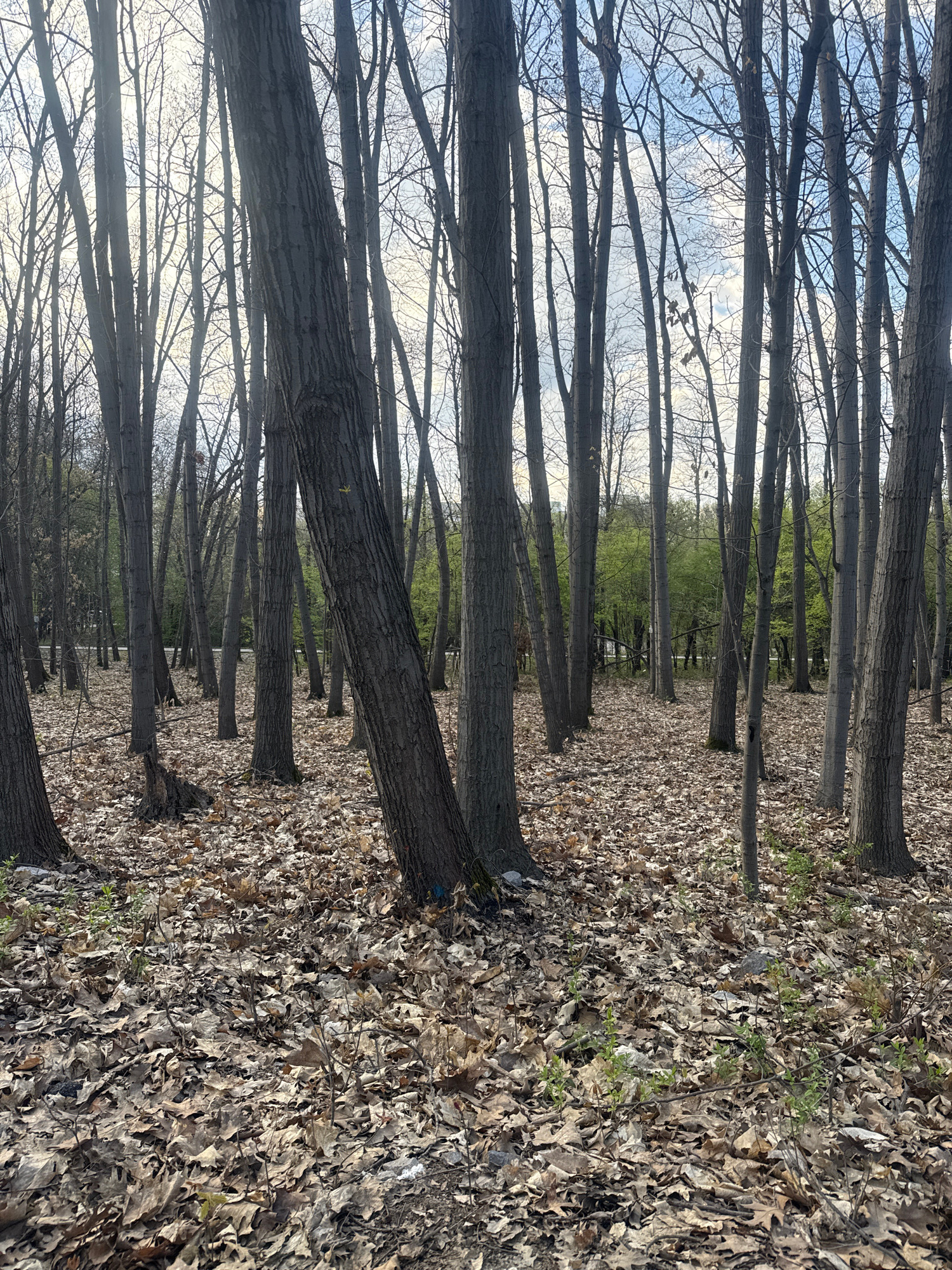 The image shows a forest setting. Numerous trees with bare branches fill the frame, creating a dense, linear pattern. The ground is covered in fallen leaves, suggesting autumn or early spring. In the…read more