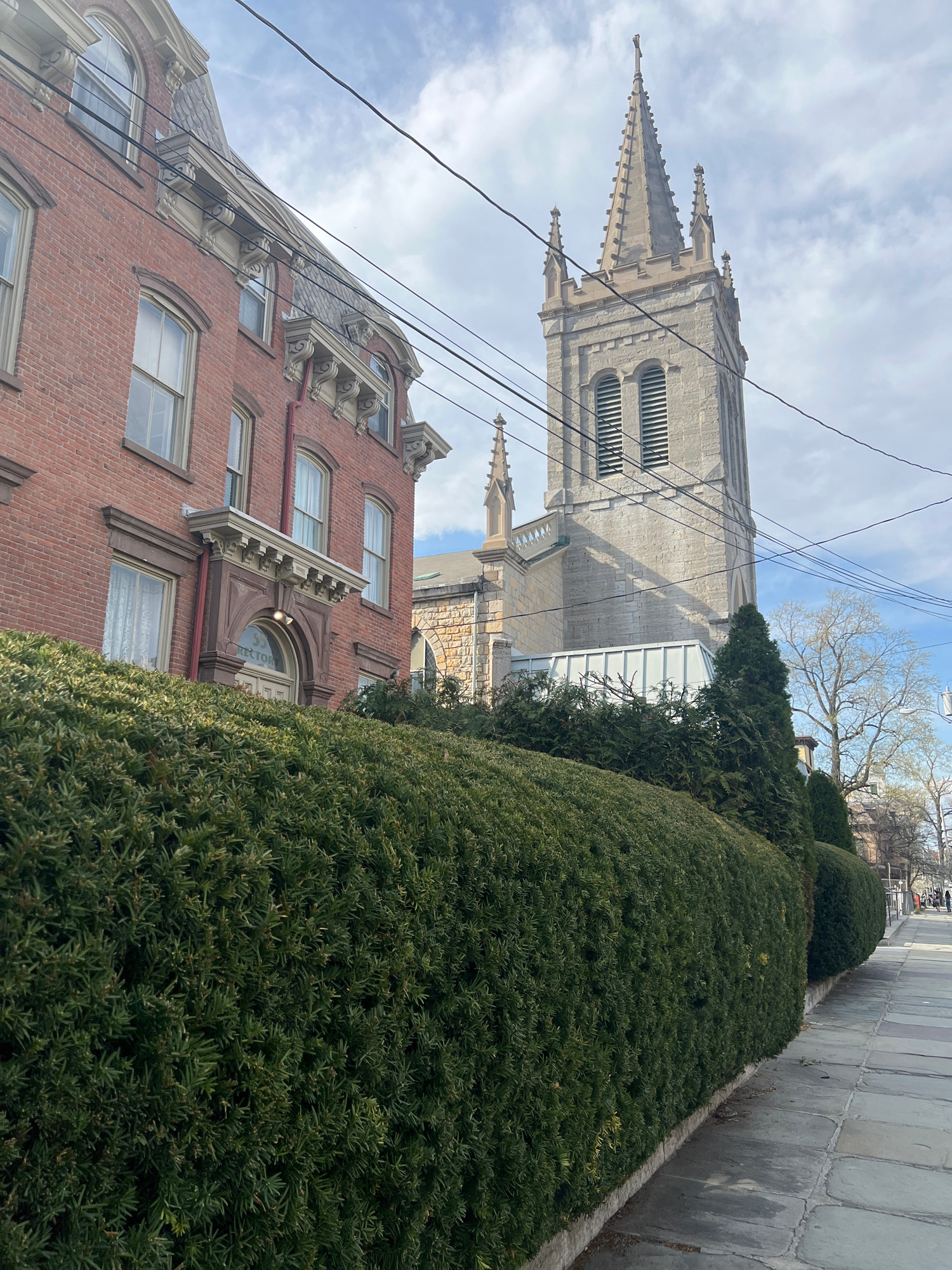 The image depicts a street scene in the City of Newburgh, United States of America. A brick building with ornate architectural details stands to the left of a church with a tall stone spire. A large,…read more
