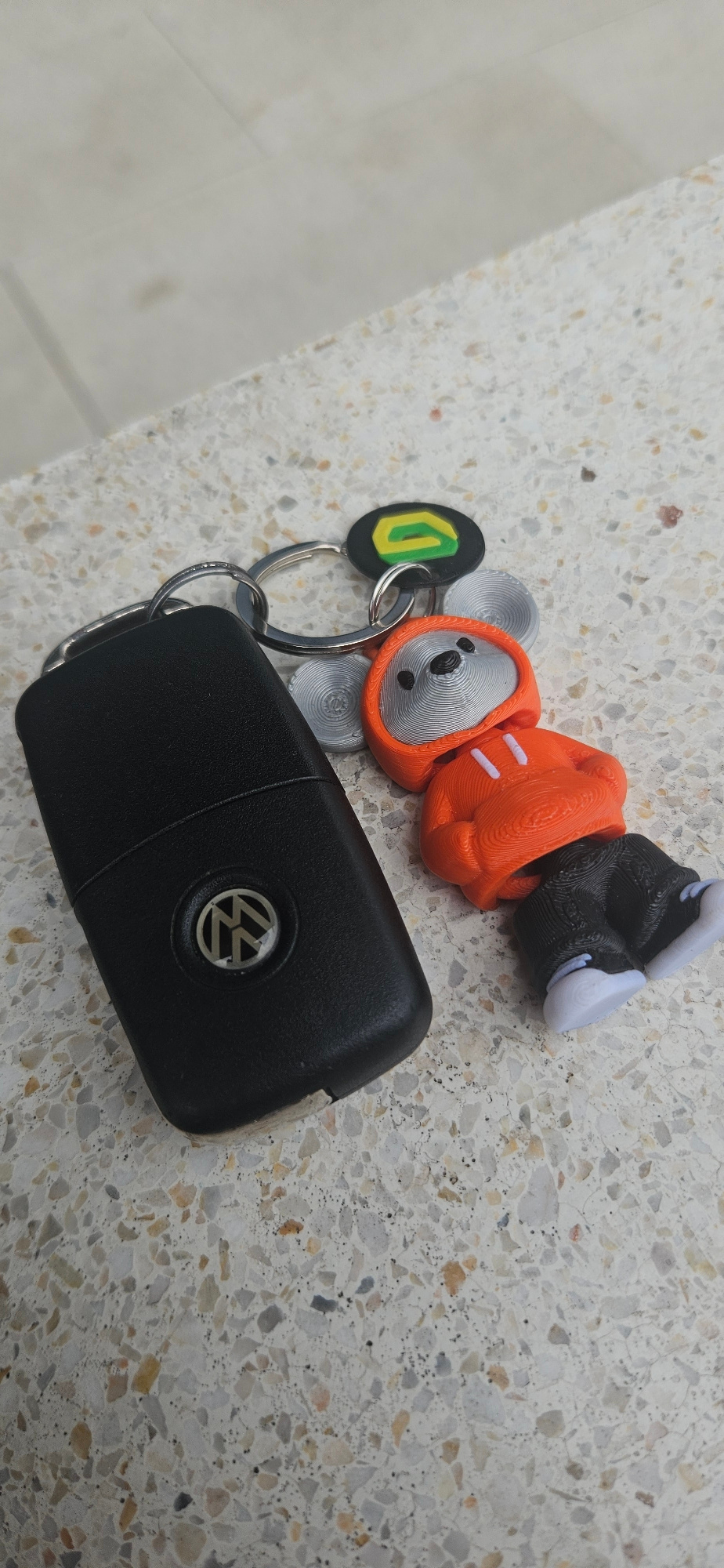 The image presents a set of car keys and associated keychains resting on a light-colored, speckled surface, likely terrazzo or a similar composite material. A smoother, lighter surface is partially vi…read more
