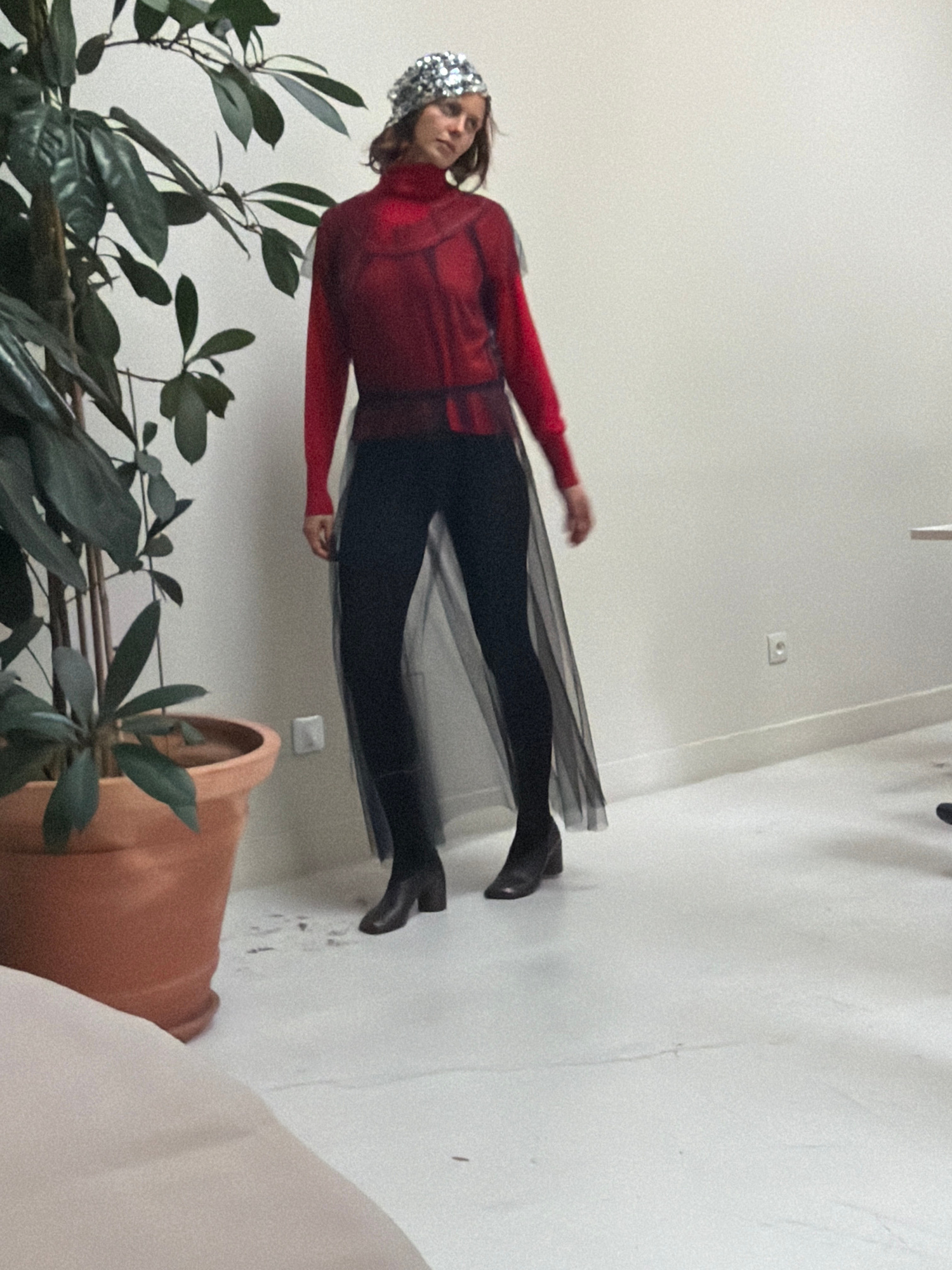A woman is dressed in a red top, black leggings, and black boots, along with a sparkly headpiece, and is lying on the floor. She is positioned near a potted plant with dark green leaves and a large cl…read more