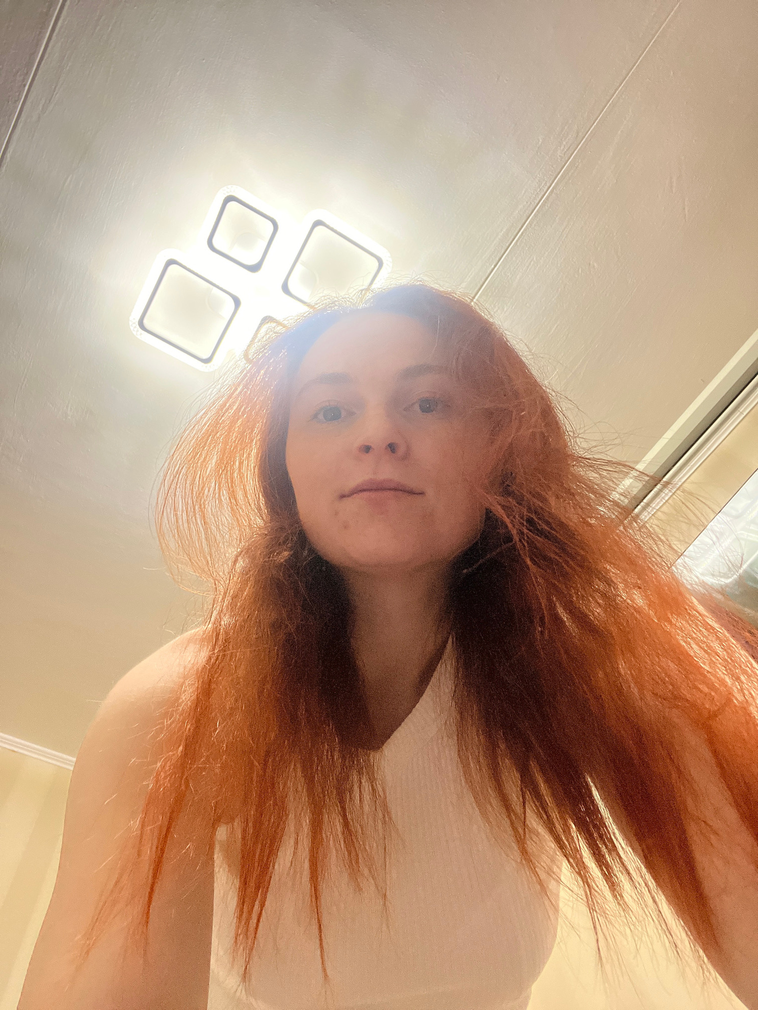 A woman with red hair is viewed from below, appearing to look directly at the viewer. The lighting is bright, with a four-panel square light fixture visible in the upper left of the frame. The woman i…read more