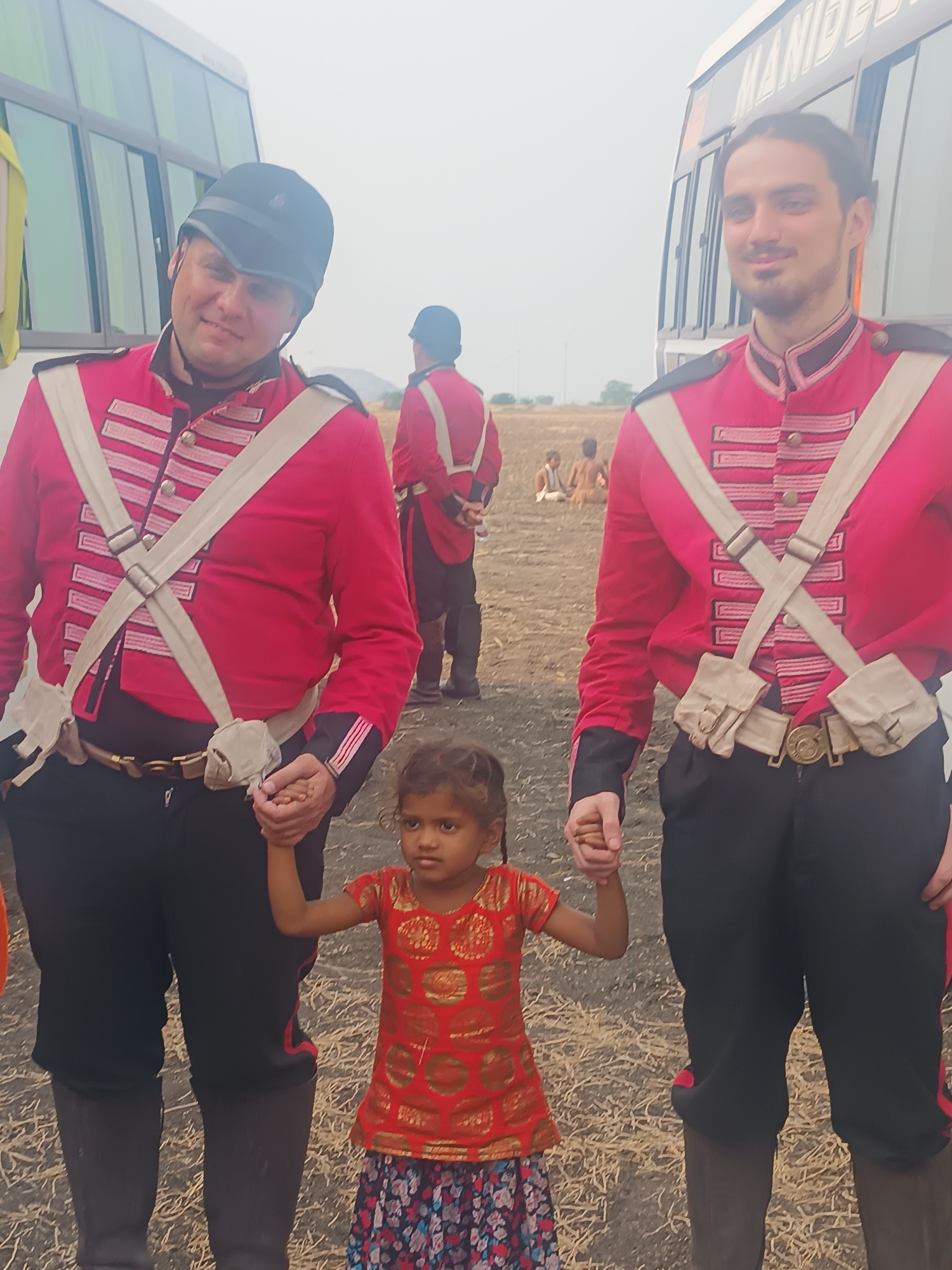 The image displays an outdoor scene in Kottalapalli, India, featuring three individuals in the immediate foreground. A young child, appearing female and of Indian descent, stands centrally, holding ha…read more