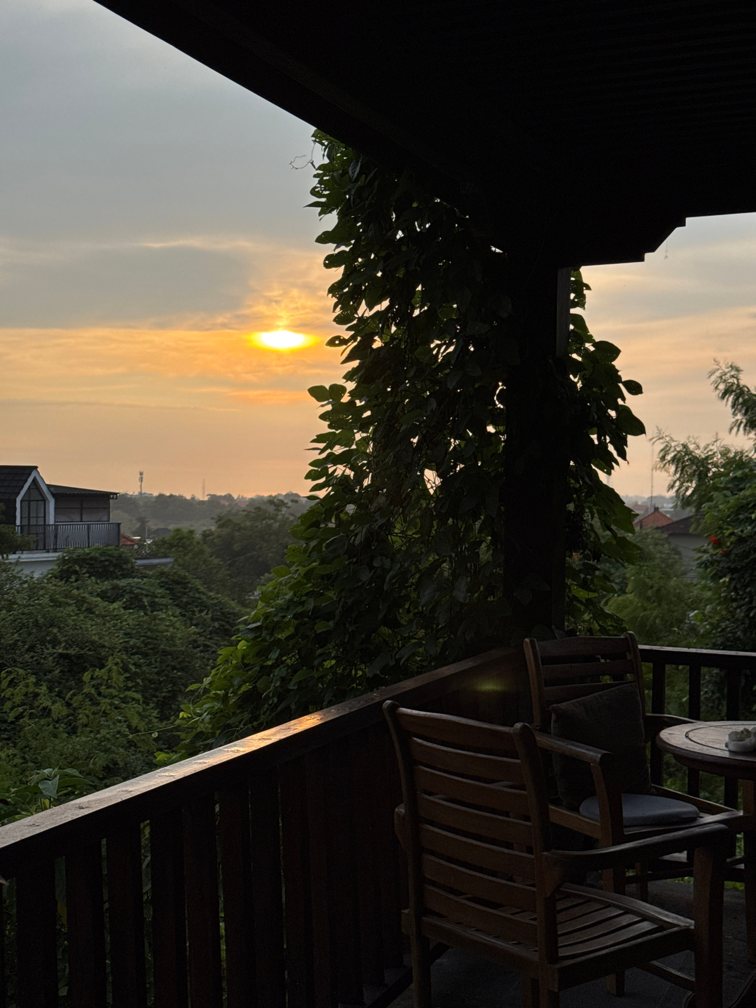 Here is a description of the image: The image depicts an outdoor scene, possibly a balcony, at sunset or sunrise in Ungasan, Indonesia. The warm glow of the sun is visible through foliage. In the forβ¦read more