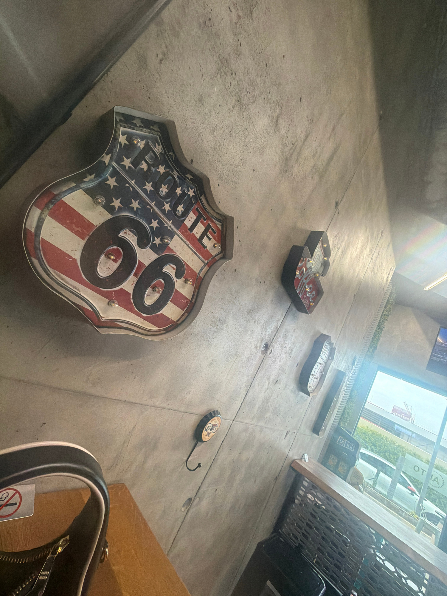 The image shows a commercial space with concrete floors, featuring decorative objects on display. These include Route 66 sign and various signs with light bulbs, some resembling diner menus. The backg…read more