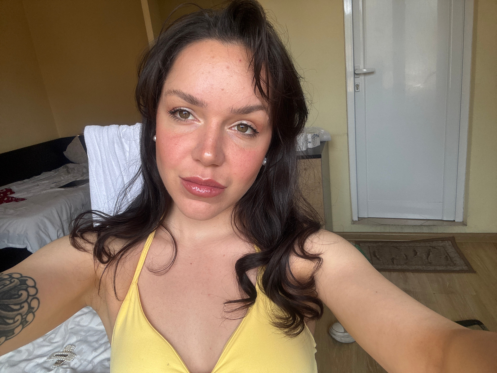 The image depicts a woman with fair skin and dark brown, wavy hair wearing a yellow top. She is facing the camera with her head tilted, revealing her face, chest, and upper arms. A tattoo is visible o…read more