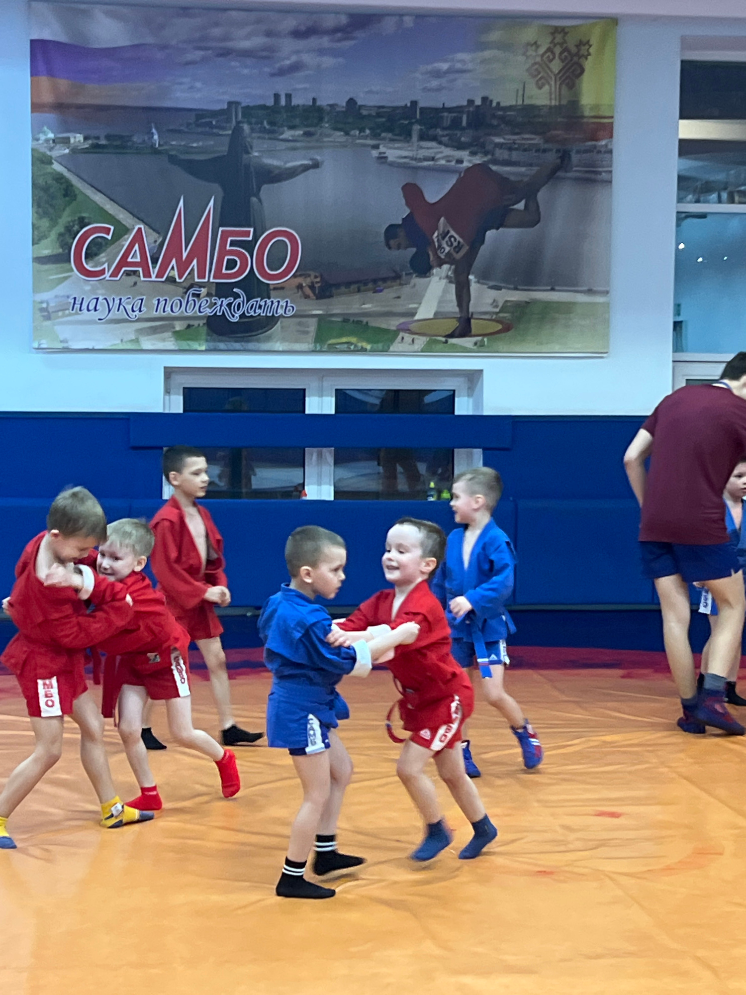 This image captures an active Sambo training session for young children inside an indoor sports facility, likely in Cheboksary, Russia. The setting features a large orange mat on the floor, providing…read more