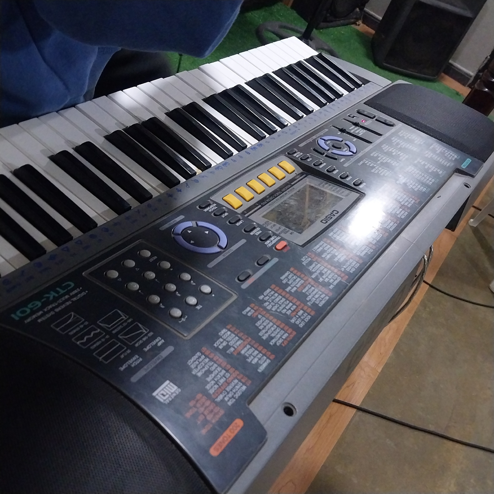The image shows a gray Casio CTK-601 keyboard. The keyboard has black and white keys, a display screen, numerous buttons, and built-in speakers. The top panel of the keyboard is labeled with various s…read more