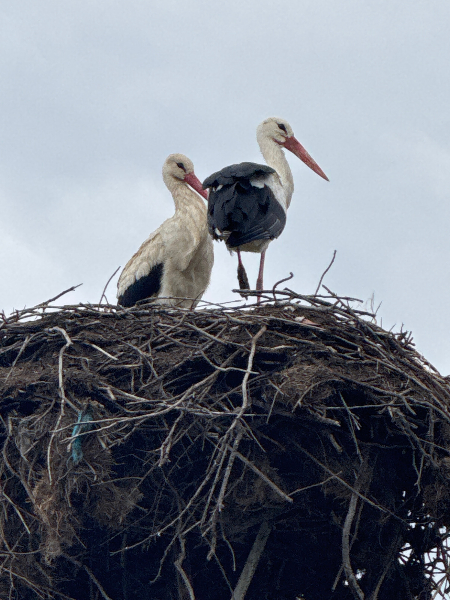 Two storks are in a large nest constructed of sticks and other materials. The storks are white with black markings on their wings and have long, red beaks. The sky is overcast and gray. The location i…read more