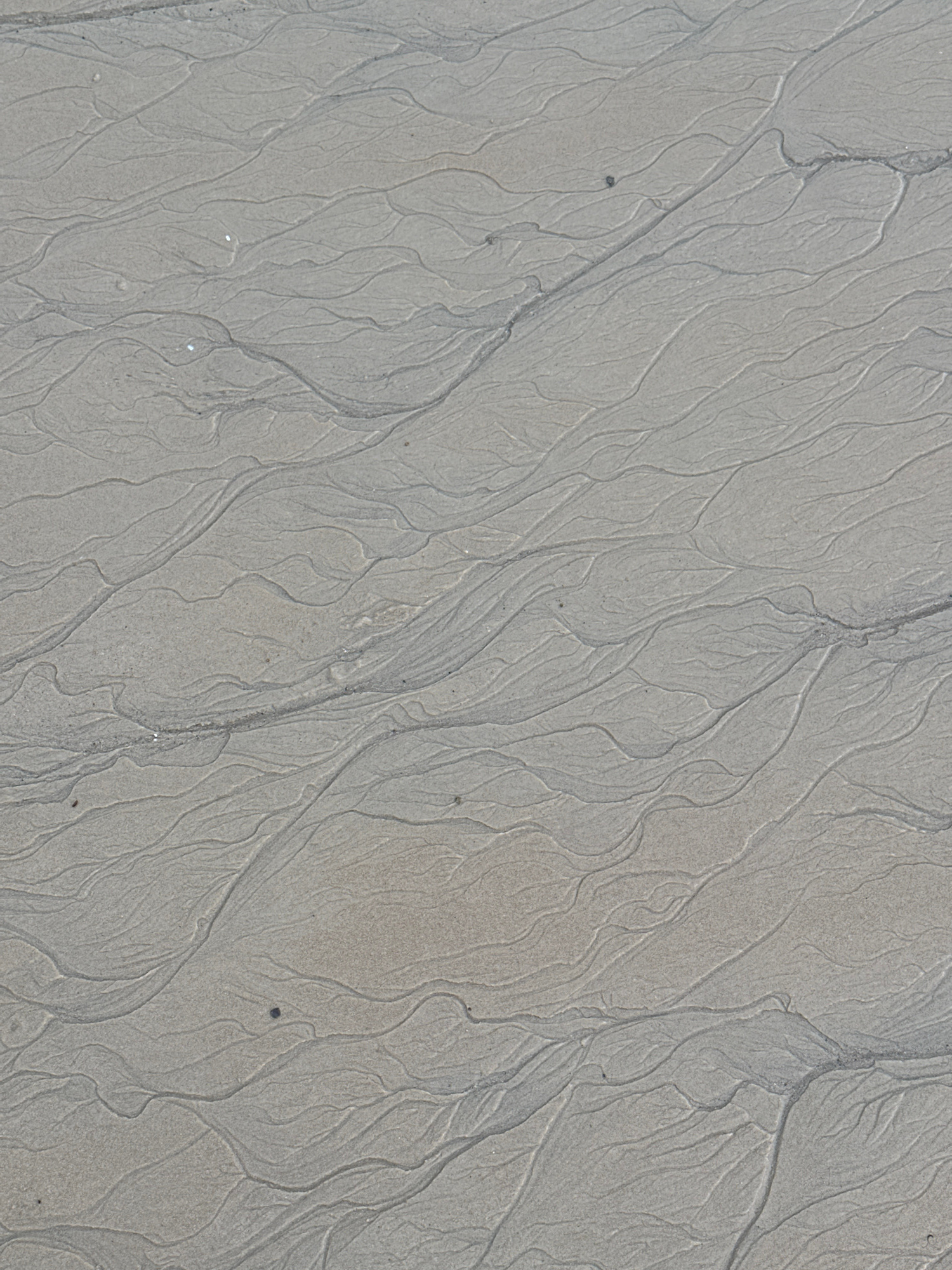 The image shows sand at a beach in an unknown city and location. The sand has been textured by water, creating a network of channels and rivulets. The overall tone is grey. There are no visible peopleβ¦read more