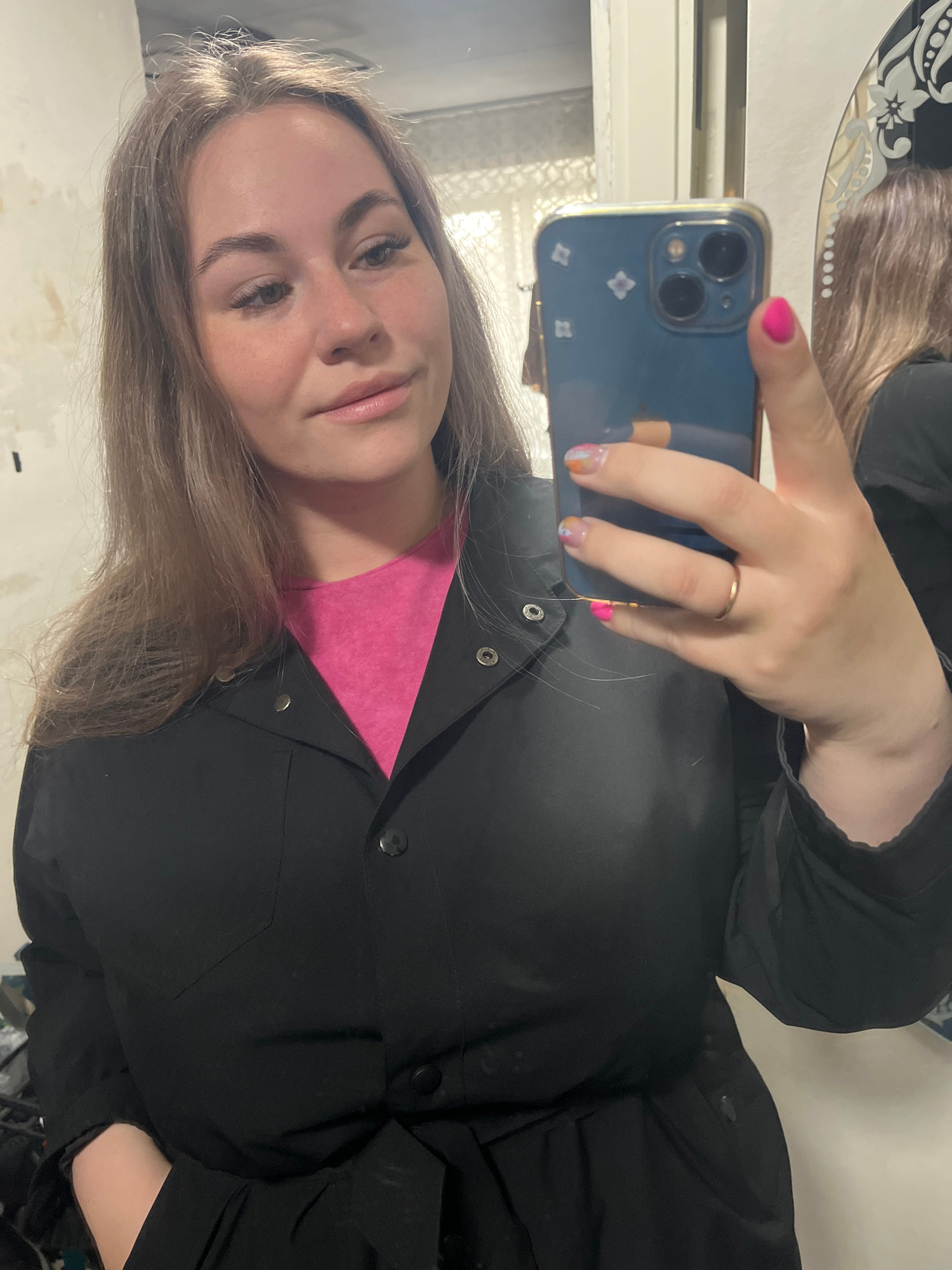 A young woman is taking a selfie in what appears to be an indoor setting. She's wearing a black jacket over a pink top. She is holding a blue smartphone in her right hand with a gold ring on her ring…read more