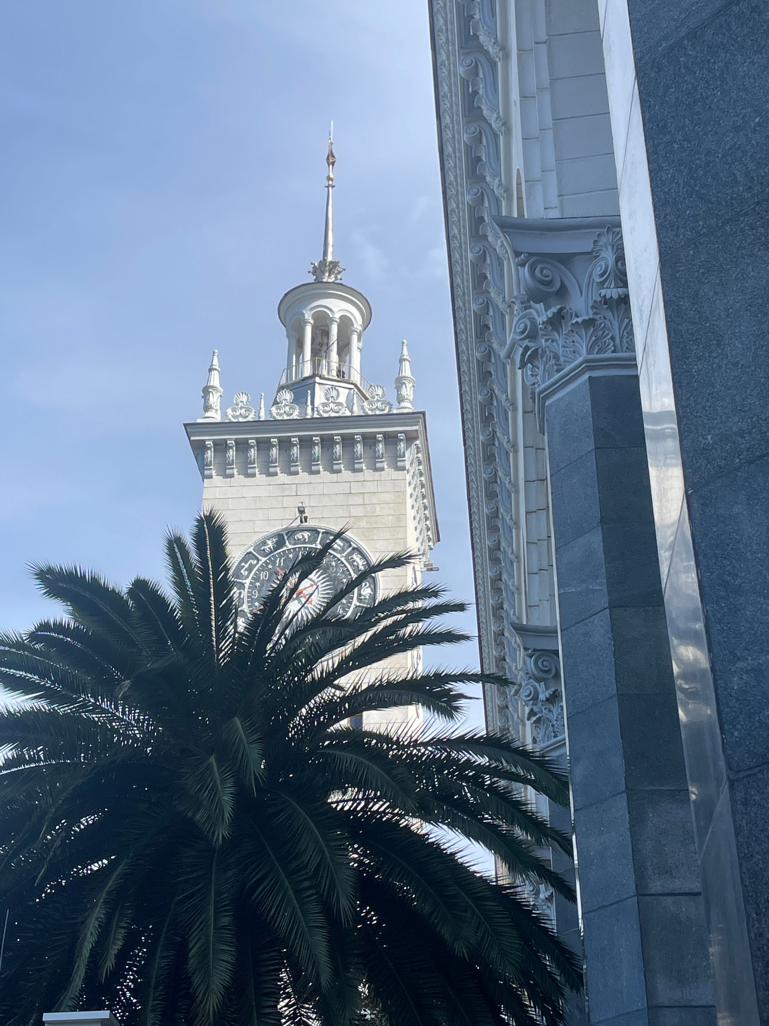 The image is an upward-angled shot featuring a tall, ornate clock tower partially obscured by a palm tree. The tower is light-colored, possibly white or light gray, with intricate architectural detailβ¦read more