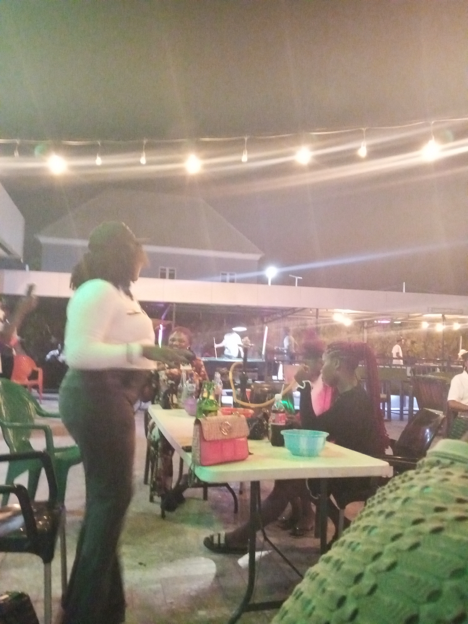 The image shows an outdoor gathering at night, likely in a public or commercial space. In the foreground, a woman in a white top and dark pants stands to the left of a table. Two people are seated at…read more