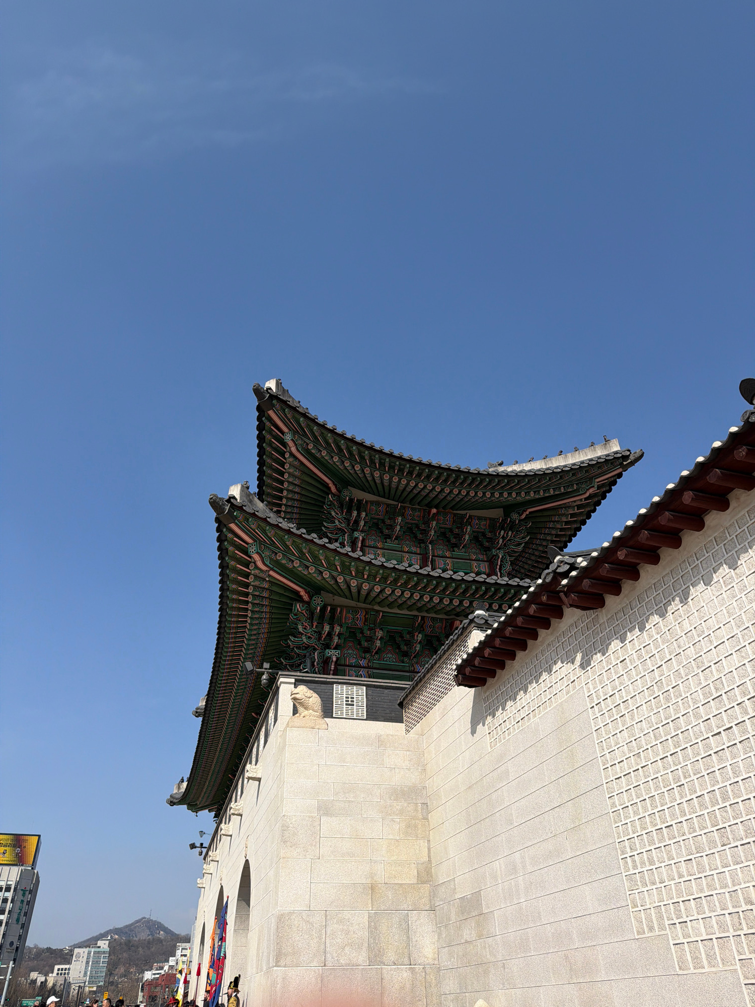 The image captures a detailed view of Gwanghwamun Gate, the main entrance to Gyeongbokgung Palace, located in central Seoul, South Korea. The central subject is the upper structure of the gate, dominaβ¦read more