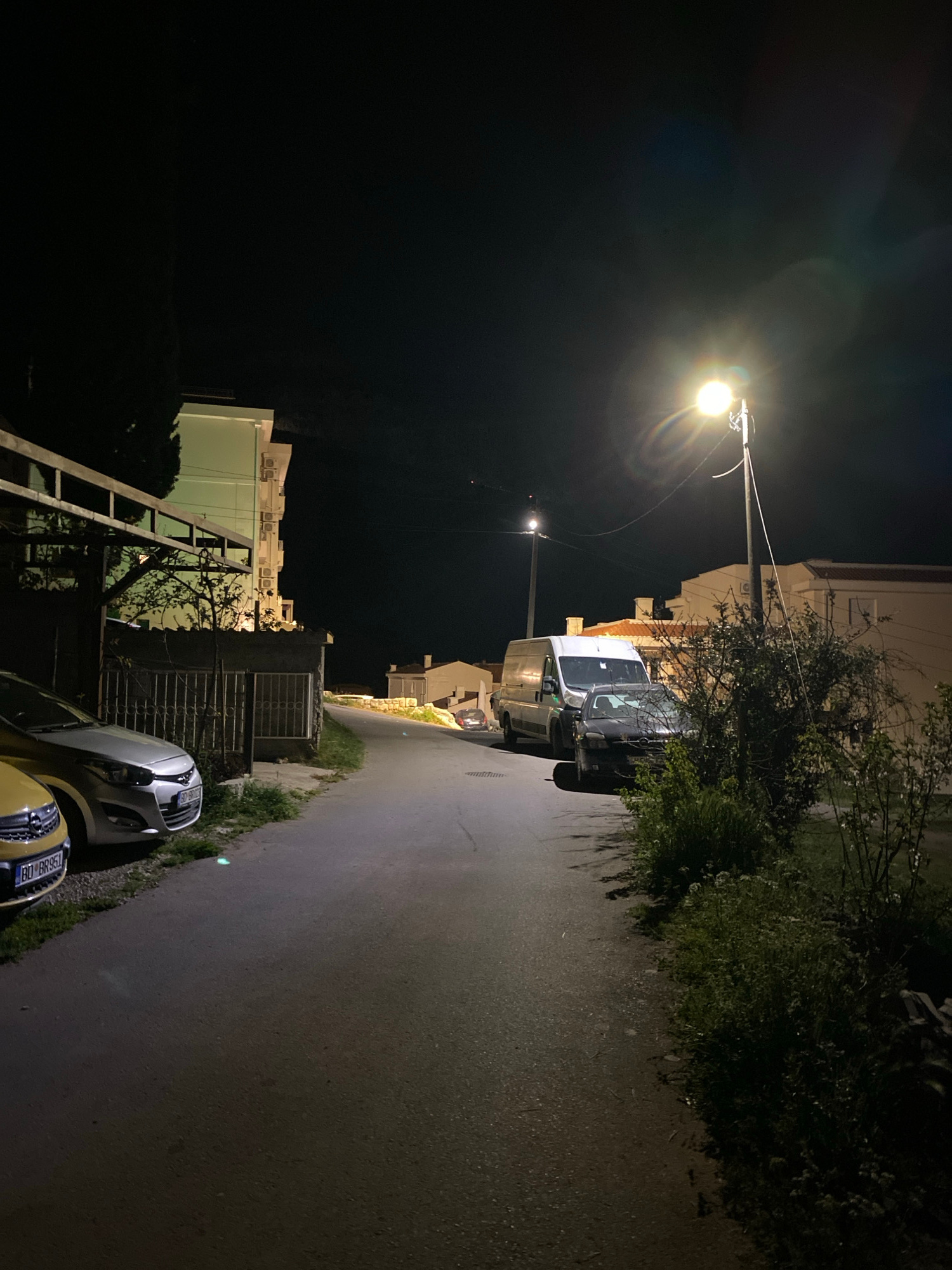 The image shows a street in Budva, Montenegro at night. Two cars are parked on the right side of the street. A white van is parked further up the street. Buildings line the street. Two street lights i…read more