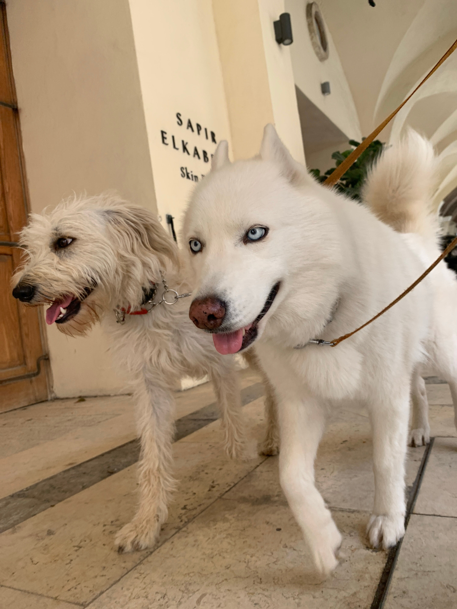 The image captures two dogs: a white husky with bright blue eyes and a smaller, fluffy white dog with a red collar. Both dogs have their tongues out and appear to be panting. They are positioned on a…read more