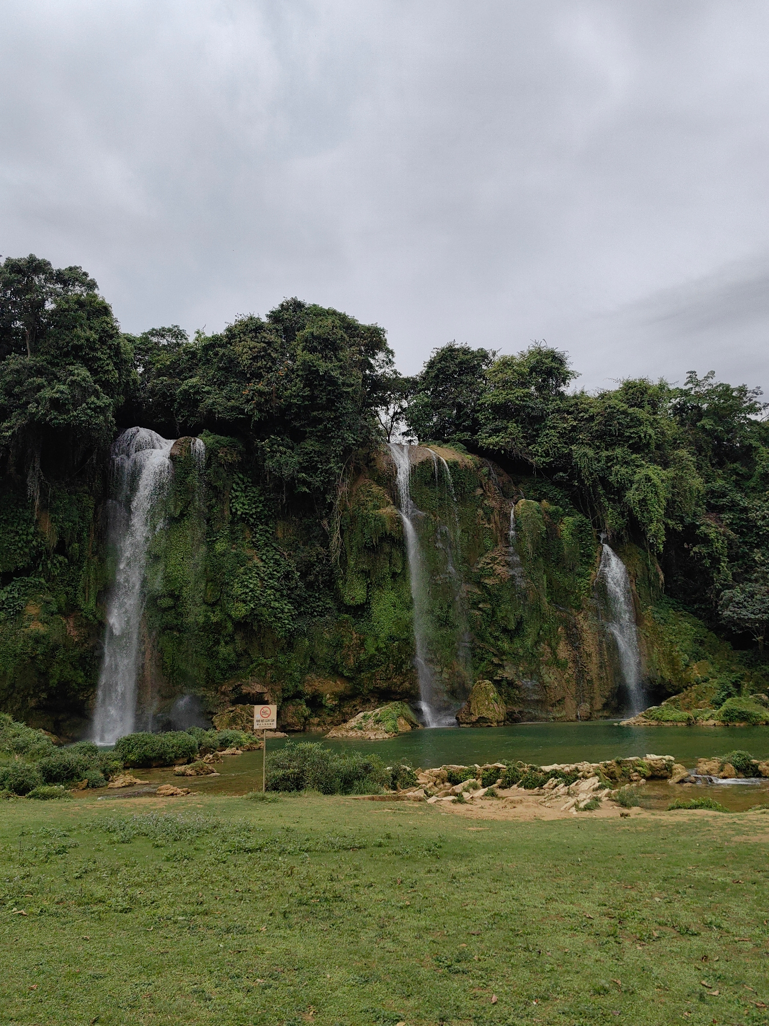 The image depicts Detian Waterfall in Daxin County, China. Five waterfalls cascade down a moss-covered cliff, surrounded by lush green trees. At the base of the falls, there is a pool of green water.…read more