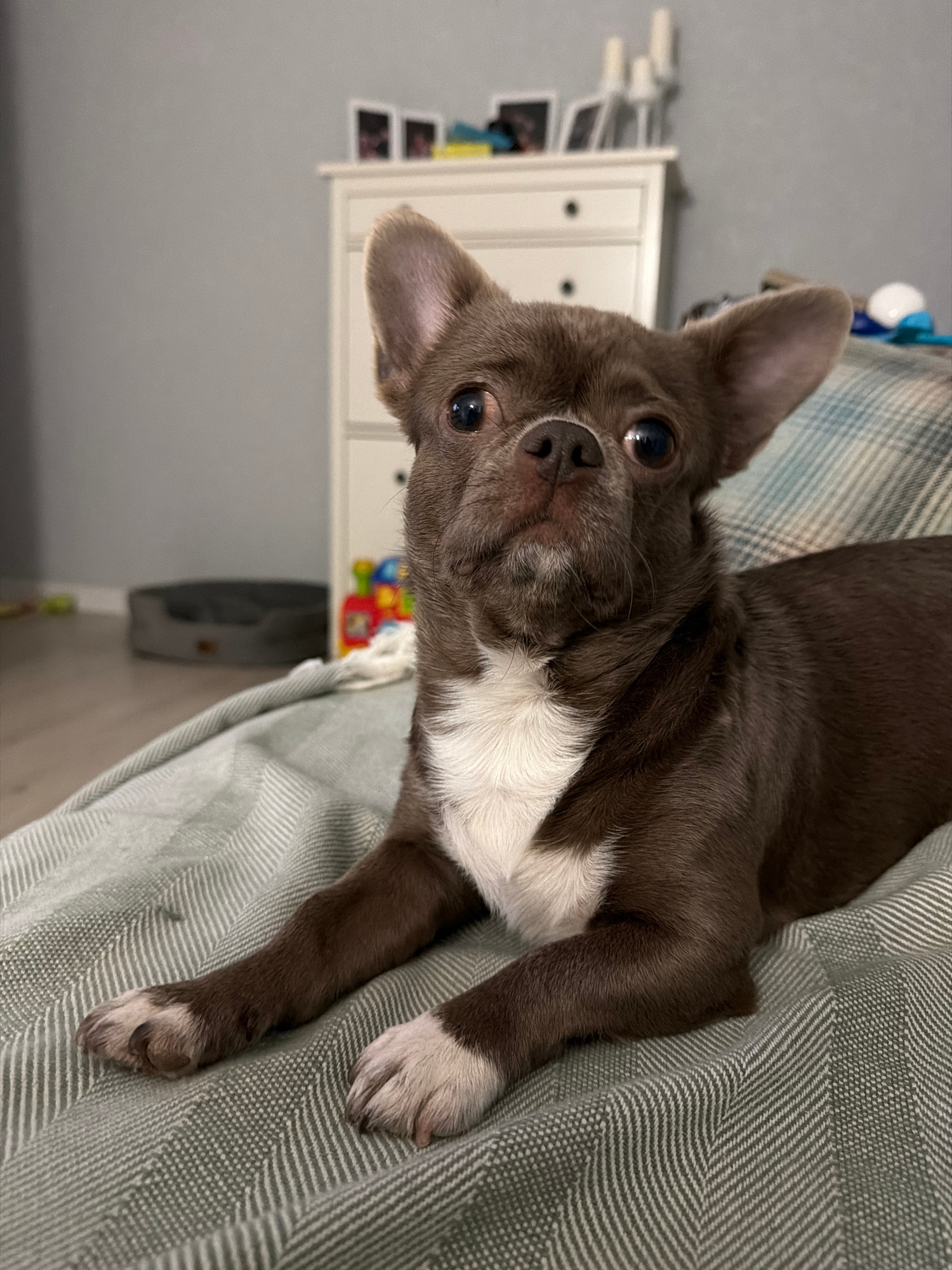 A brown and white Chihuahua lies on a gray herringbone blanket. The dog has brown fur on its head, back, and legs, with white fur on its chest and paws. The dog's head is turned towards the camera, an…read more
