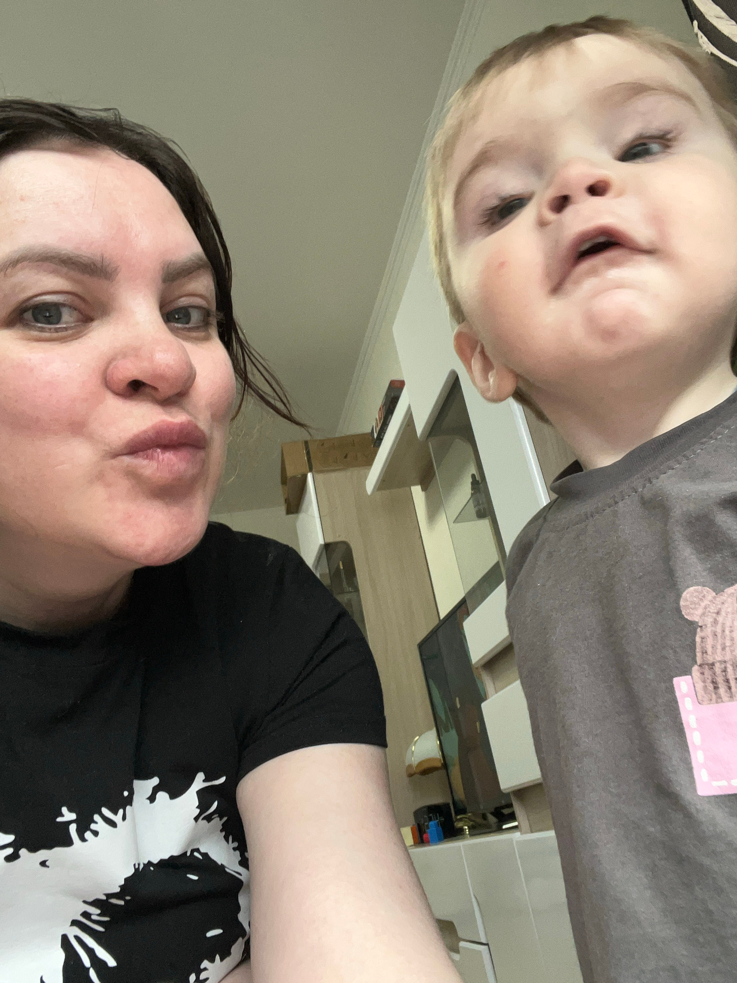 A rotated, low-angle indoor photograph captures a woman and a young child looking directly into the camera. The image is oriented such that the woman is positioned on the lower right and the child on…read more