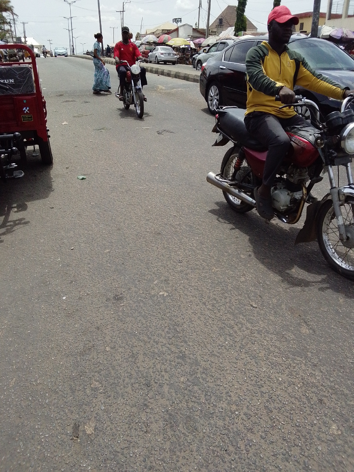 The image depicts a street scene in Lokoja, Nigeria. A person wearing a red cap and a yellow and green jacket is riding a red motorcycle in the right-hand side of the frame. Another person in a red sh…read more
