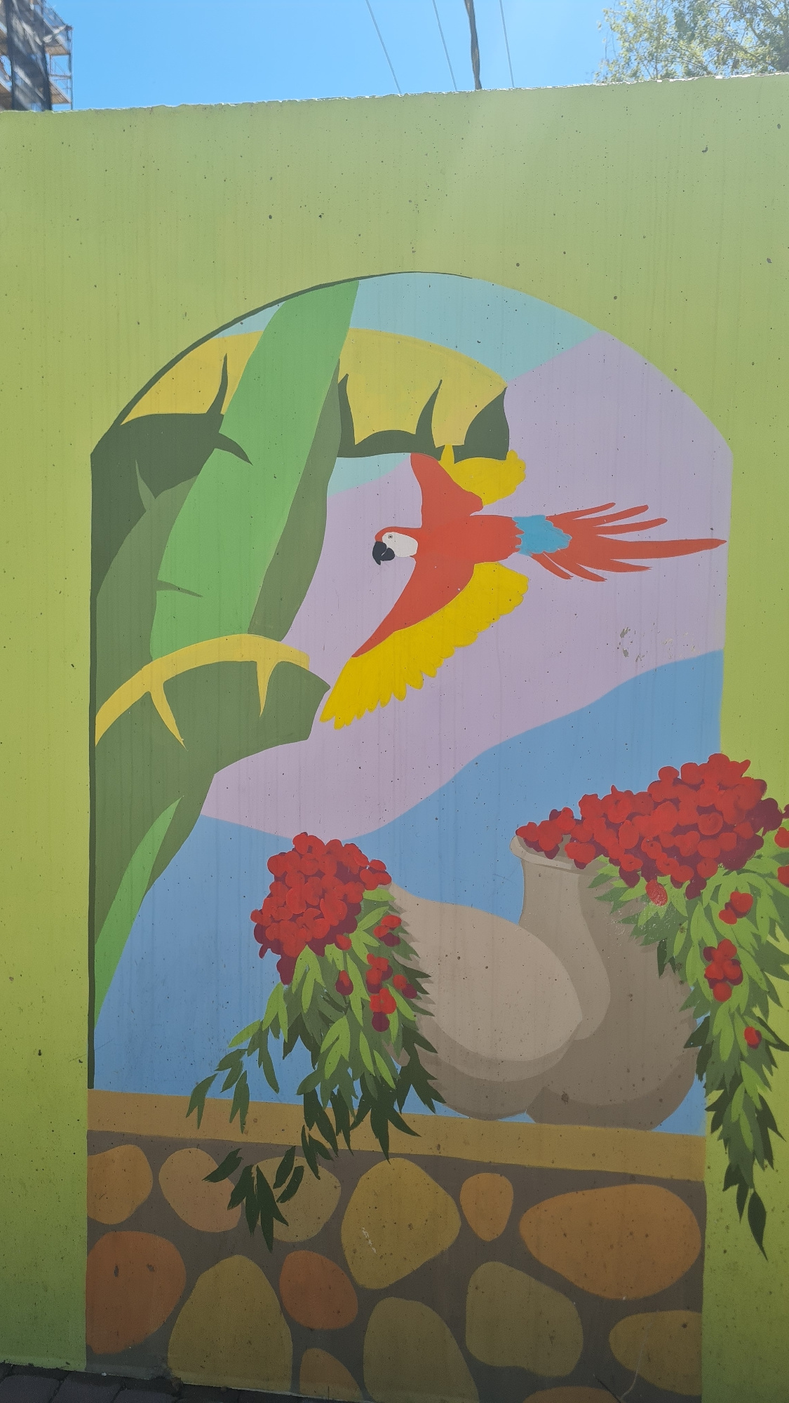 The image depicts a colorful mural, likely located in Nahariyya, Israel. The mural is painted on a light green surface. The mural itself features a stylized depiction of nature. A vibrant red parrot…read more