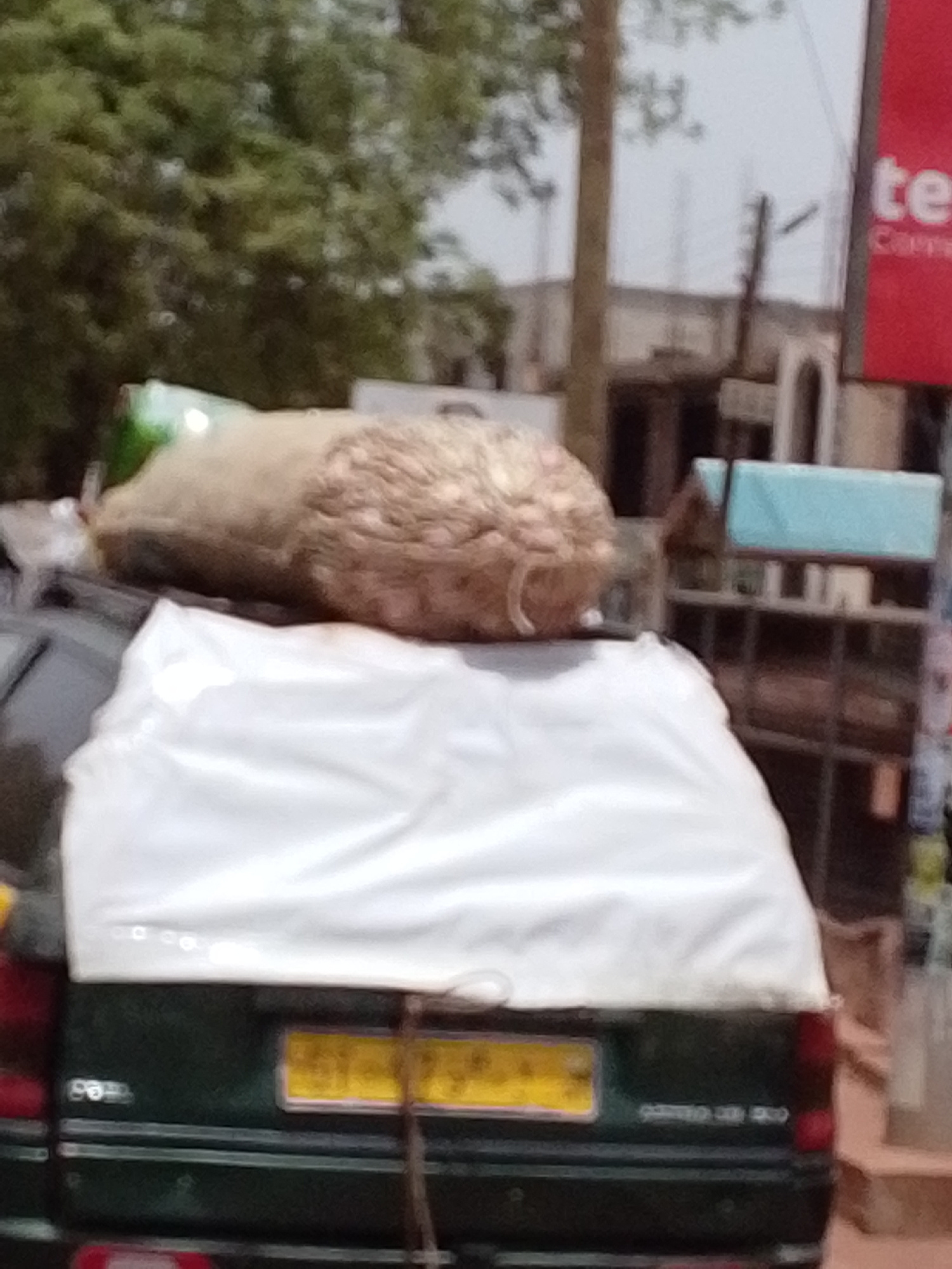 The image depicts the rear of a dark-colored Opel car, likely an Opel Astra, laden with goods, situated in what is presumably Tamale, Ghana. A large sack filled with what appears to be yams or similar…read more