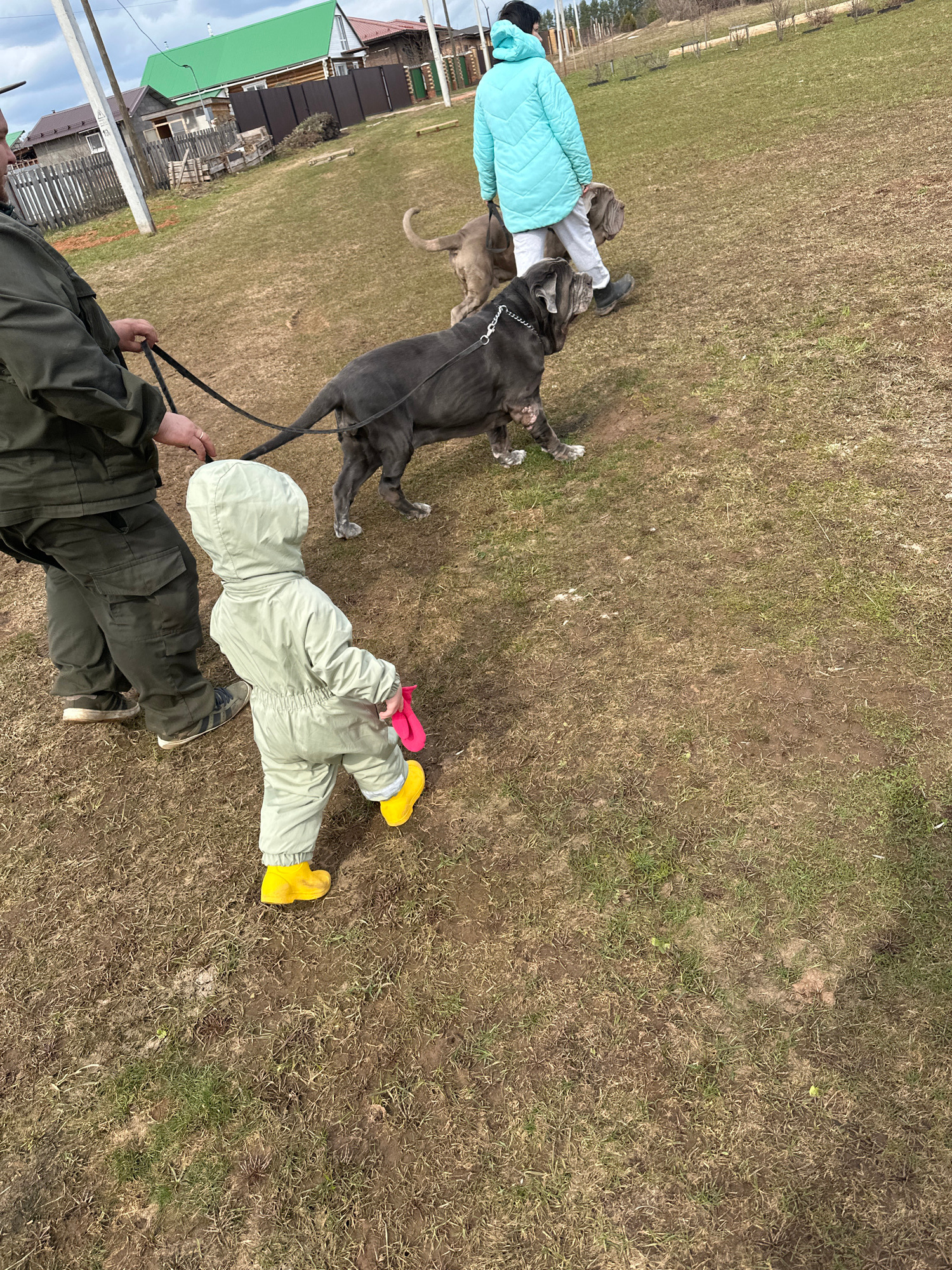 The image depicts an outdoor scene, likely in Ludorvay, Russia, characterized by a grassy area with dry patches. Three individuals and two dogs are visible. One adult stands on the left, wearing dark…read more