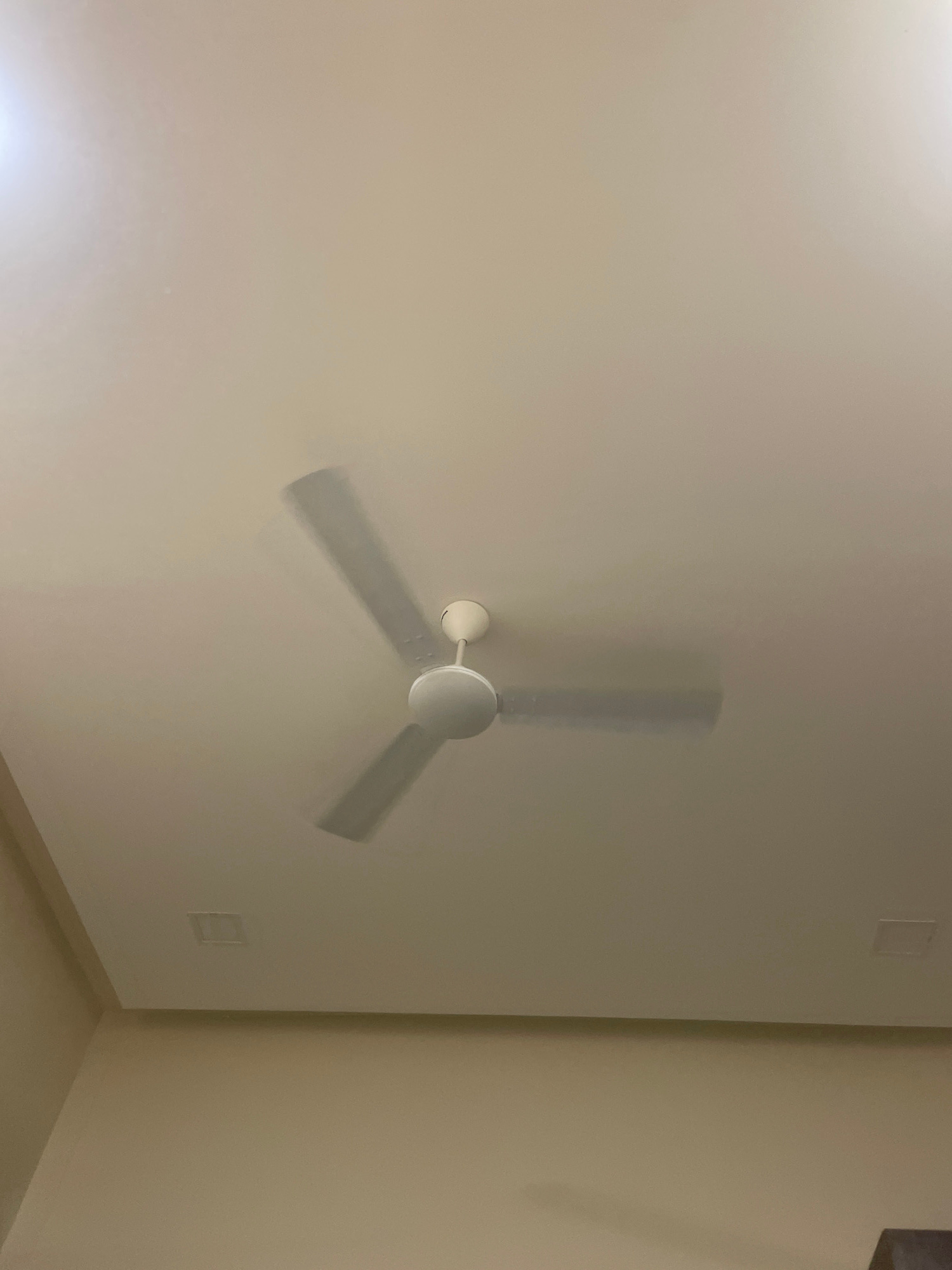 The image depicts an indoor scene in a room located in Kolhapur, India. A white, three-bladed ceiling fan is centrally positioned, actively rotating, as evidenced by significant motion blur on its bla…read more