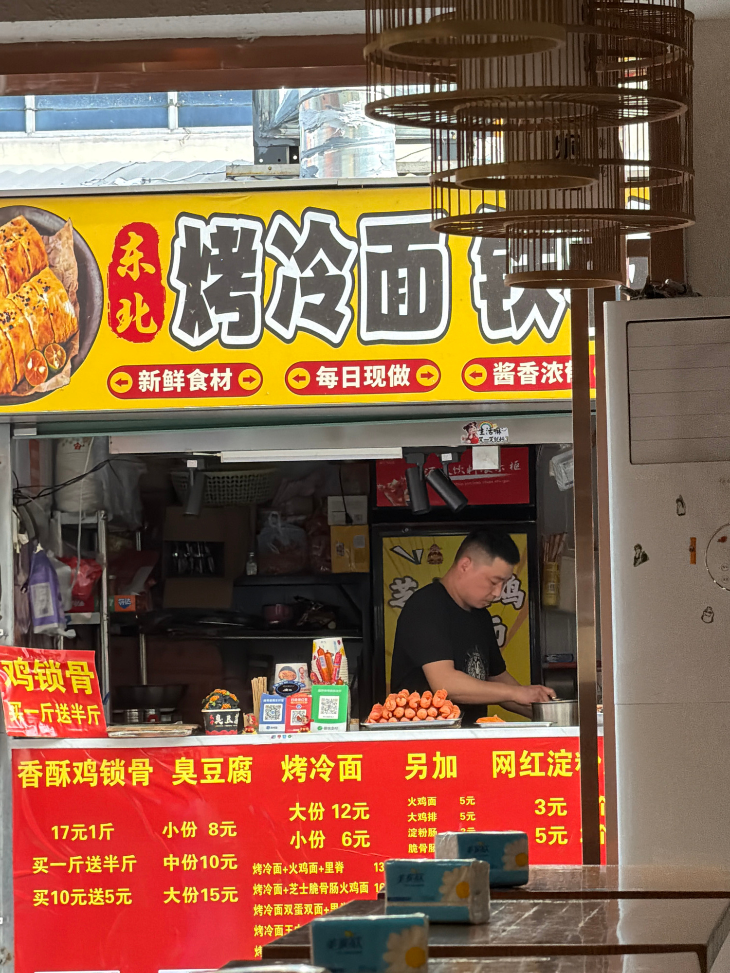 The image shows a street food stall in Jiangning District, China, offering local snacks. A man in a black t-shirt stands inside the stall, possibly preparing food. The stall has yellow and red signs a…read more