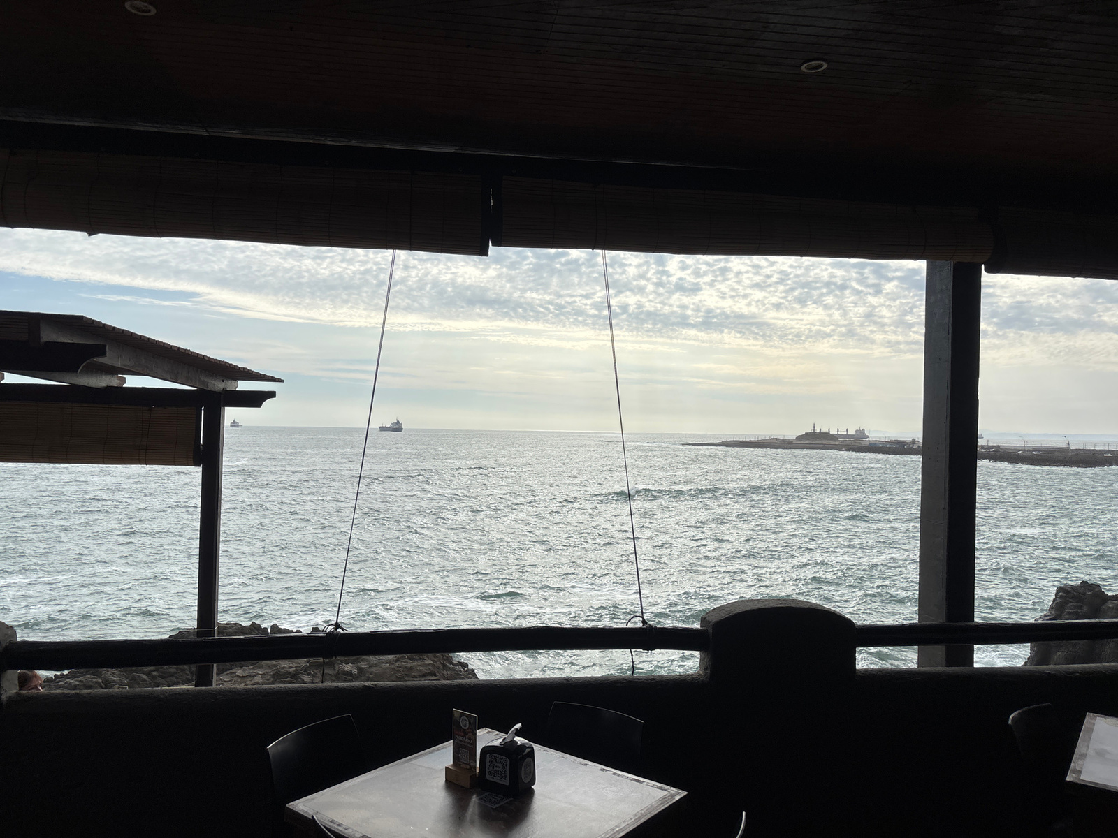 The image presents a view from inside a darkly lit establishment, likely a restaurant or cafe, looking out over a wide ocean vista. The scene is set in Arica, Chile. In the foreground, the interior a…read more