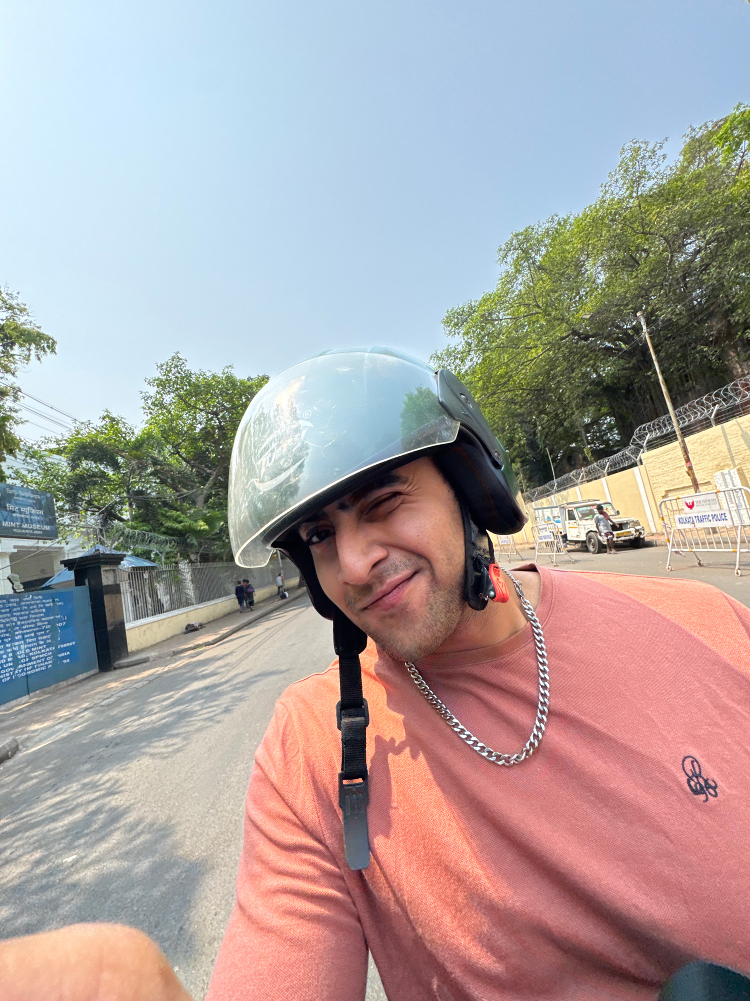 A young adult male, positioned centrally, takes an outdoor selfie on a street in Kolkata, India, specifically near the India Government Mint Museum in Alipore. He wears a light blue motorcycle helmetβ¦read more