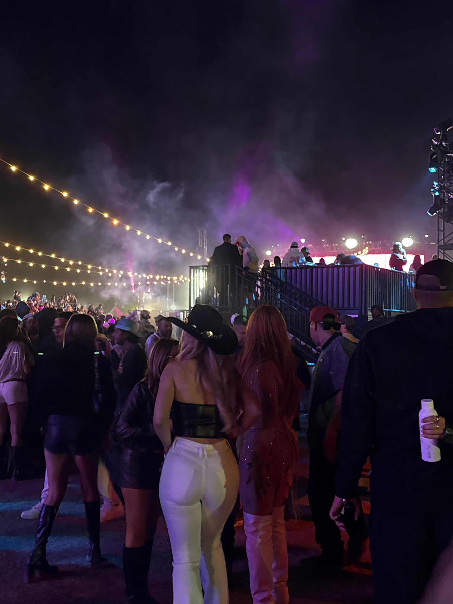 The image depicts a crowd of people at night, likely in Thermal, USA. There is a stage or raised platform in the background with people on it, illuminated by bright lights. String lights hang overhead…read more