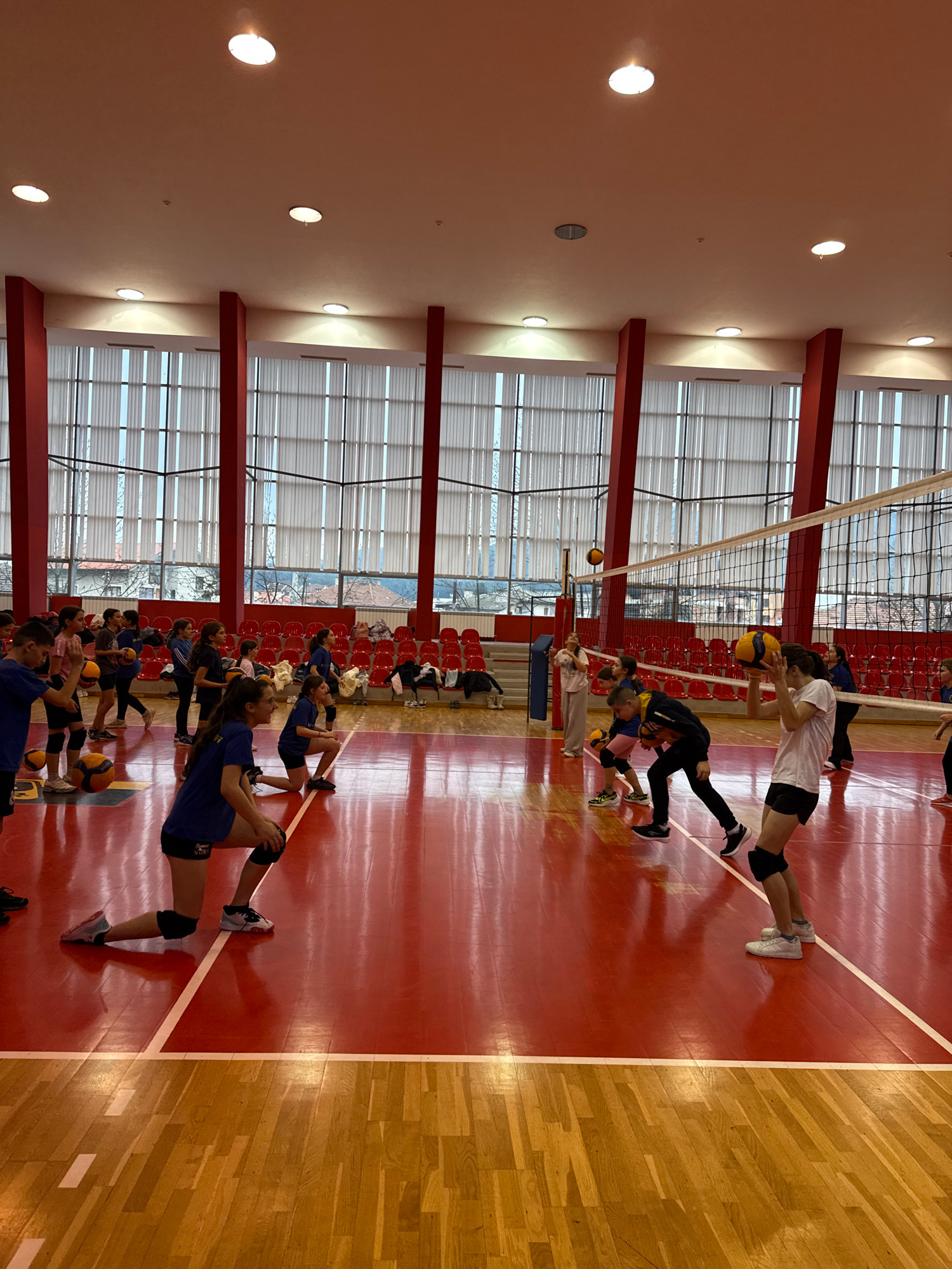 The image shows a volleyball practice in a gymnasium. A group of young volleyball players are divided on either side of a net. Some players are actively practicing their bump technique, while others a…read more