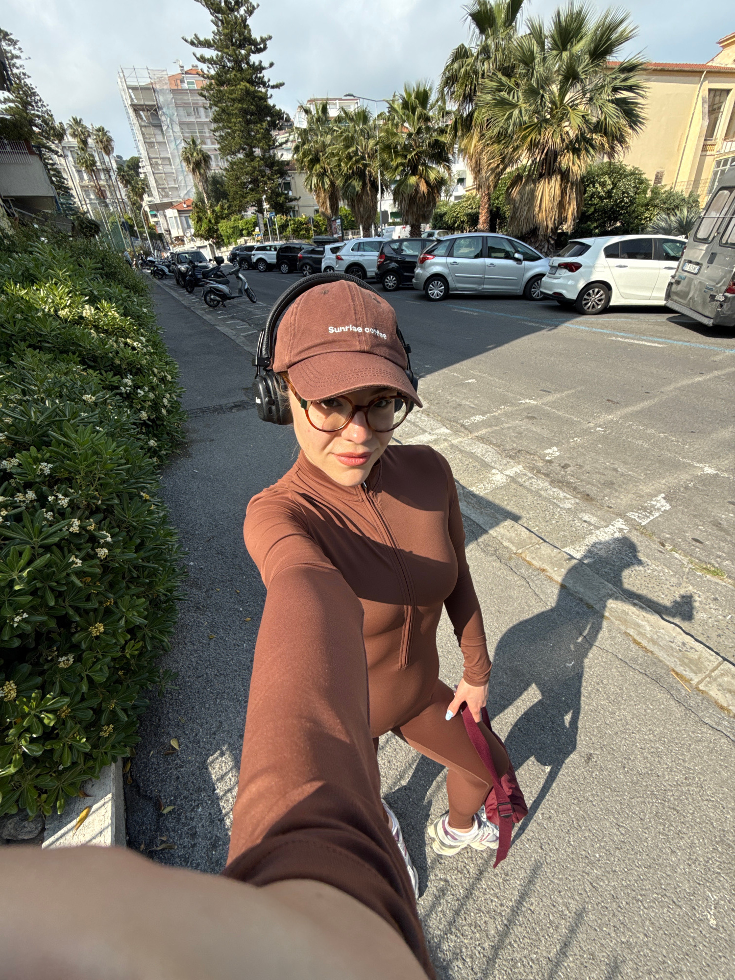 The image shows a woman taking a selfie outdoors in Sanremo, Italy. She is wearing a brown athletic outfit, a matching baseball cap with the text "Sunrise Coffee," headphones, and sneakers. She is hol…read more