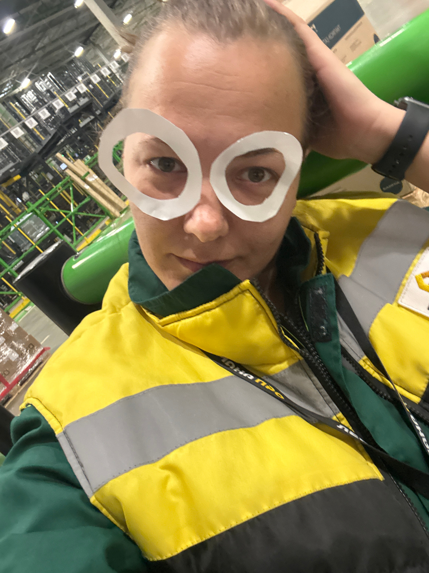 A person is posing with white paper circles over their eyes, resembling glasses. The person has fair skin, short hair, and a dark smartwatch on their left wrist. They are wearing a green and yellow sa…read more