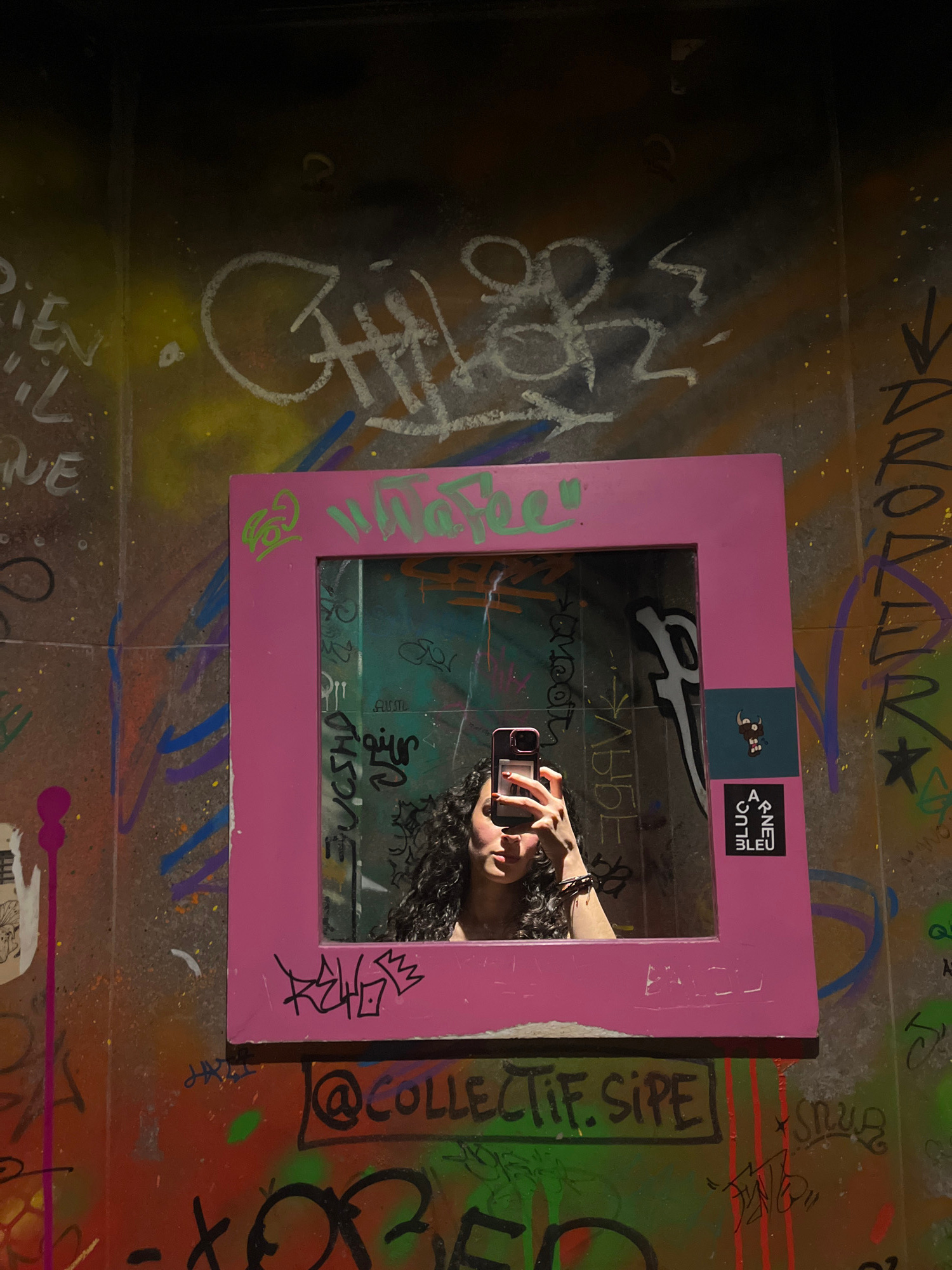 The image captures a pink-framed mirror propped against a graffitied wall, reflecting a person holding a smartphone. The wall behind the mirror is covered in layers of spray paint, featuring various t…read more