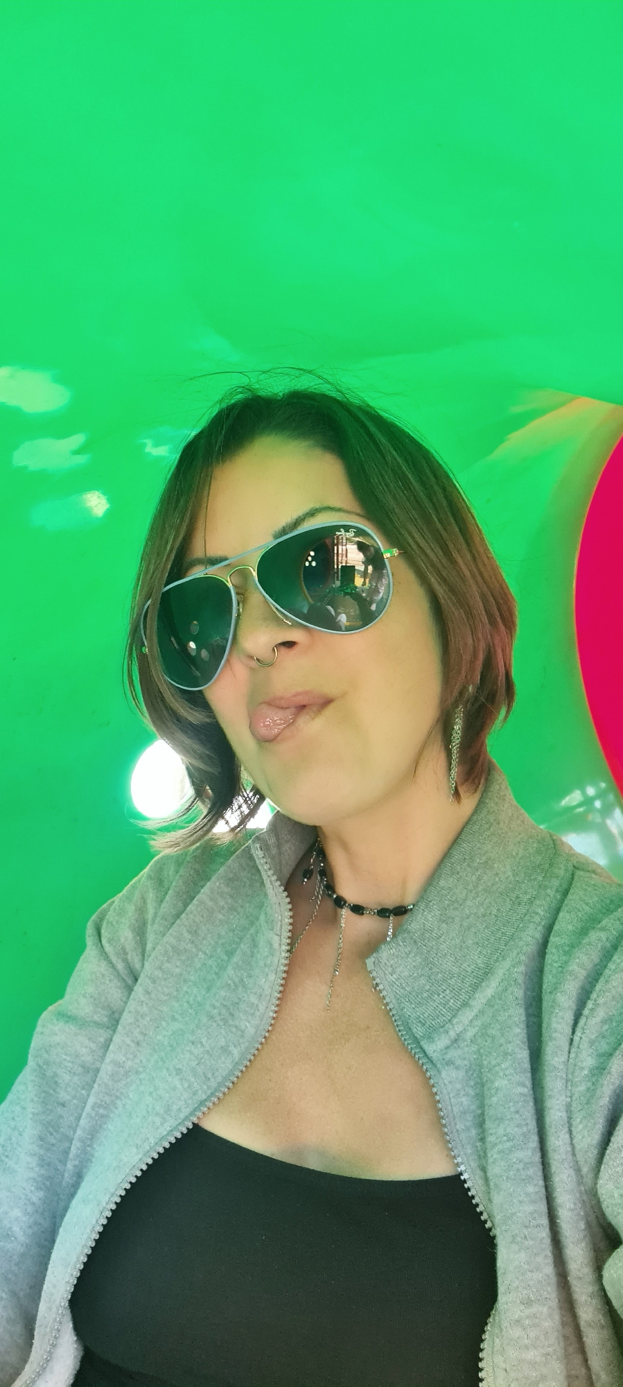A woman poses indoors. She wears aviator sunglasses, a gray zip-up hoodie, and a black top. She has a nose ring and a beaded necklace. The environment consists of green walls and ceiling, with a hint…read more