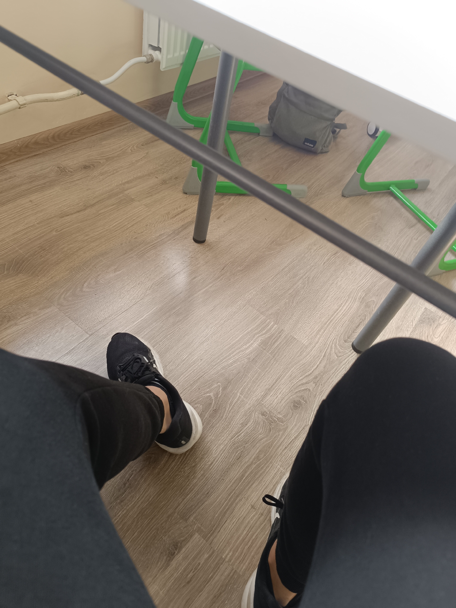 The image shows a first-person perspective of someone sitting at a desk. The person is wearing black leggings and black sneakers with white soles. The desk has a white top and a green and gray metal f…read more
