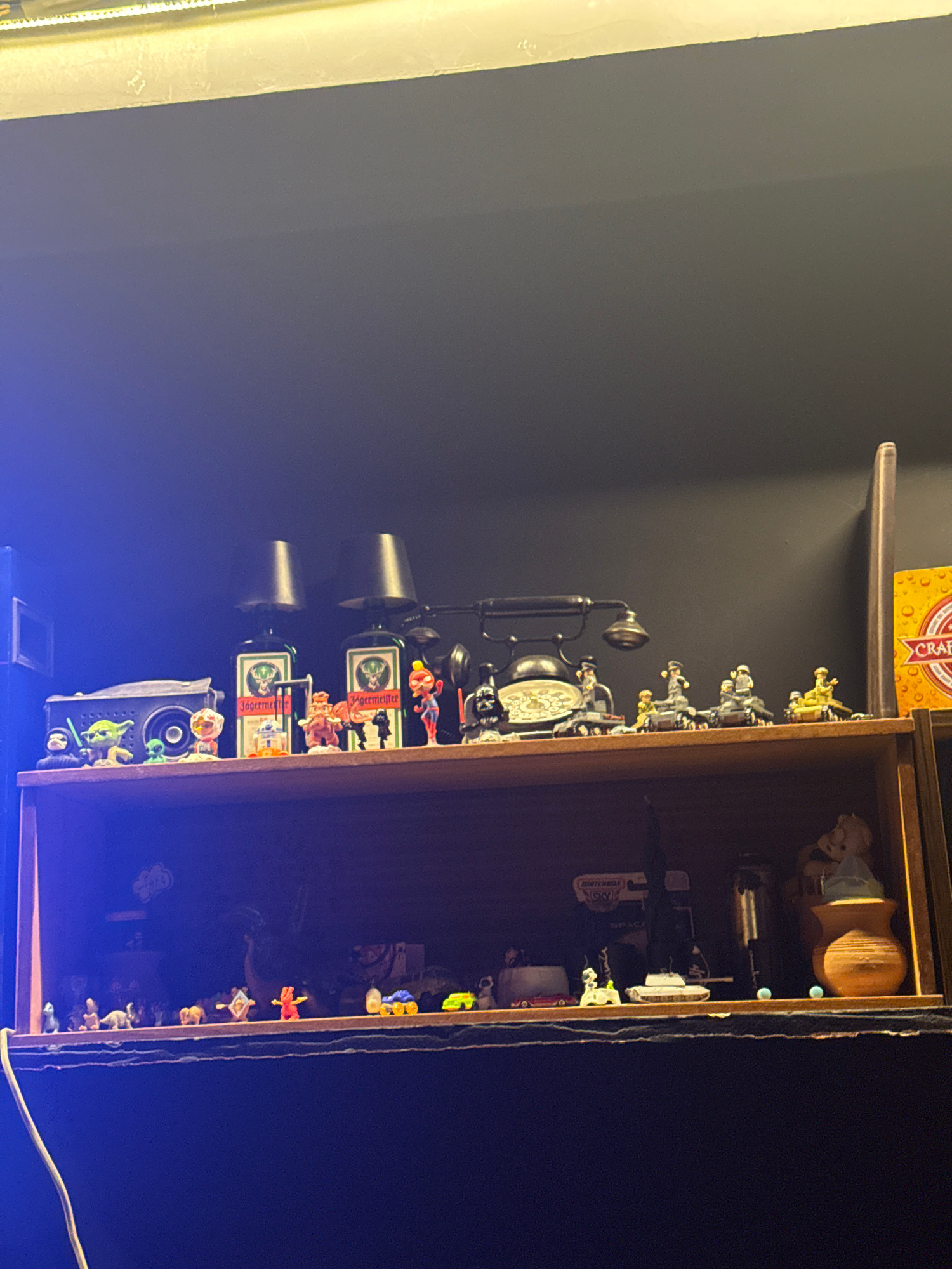 The image shows a dark room with a wooden shelf mounted on a dark gray wall. The shelf is filled with various objects, including figurines, a toy telephone, and a bottle of Jägermeister. The lighting…read more