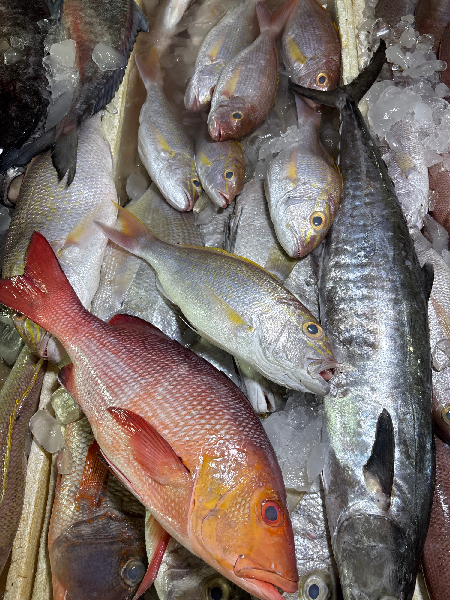 The image displays a variety of freshly caught fish, arranged on a bed of ice. The fish include red snapper, yellowtail snapper, and what appears to be a Spanish mackerel. The fish are presented in a…read more