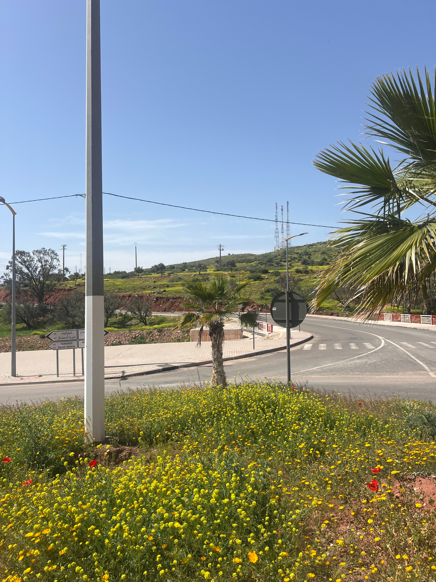 The image shows a road in Ouaouizert, Morocco, flanked by a field of yellow flowers. A palm tree is present on the left, partially obscuring the blue sky. A green hillside rises in the background, dot…read more