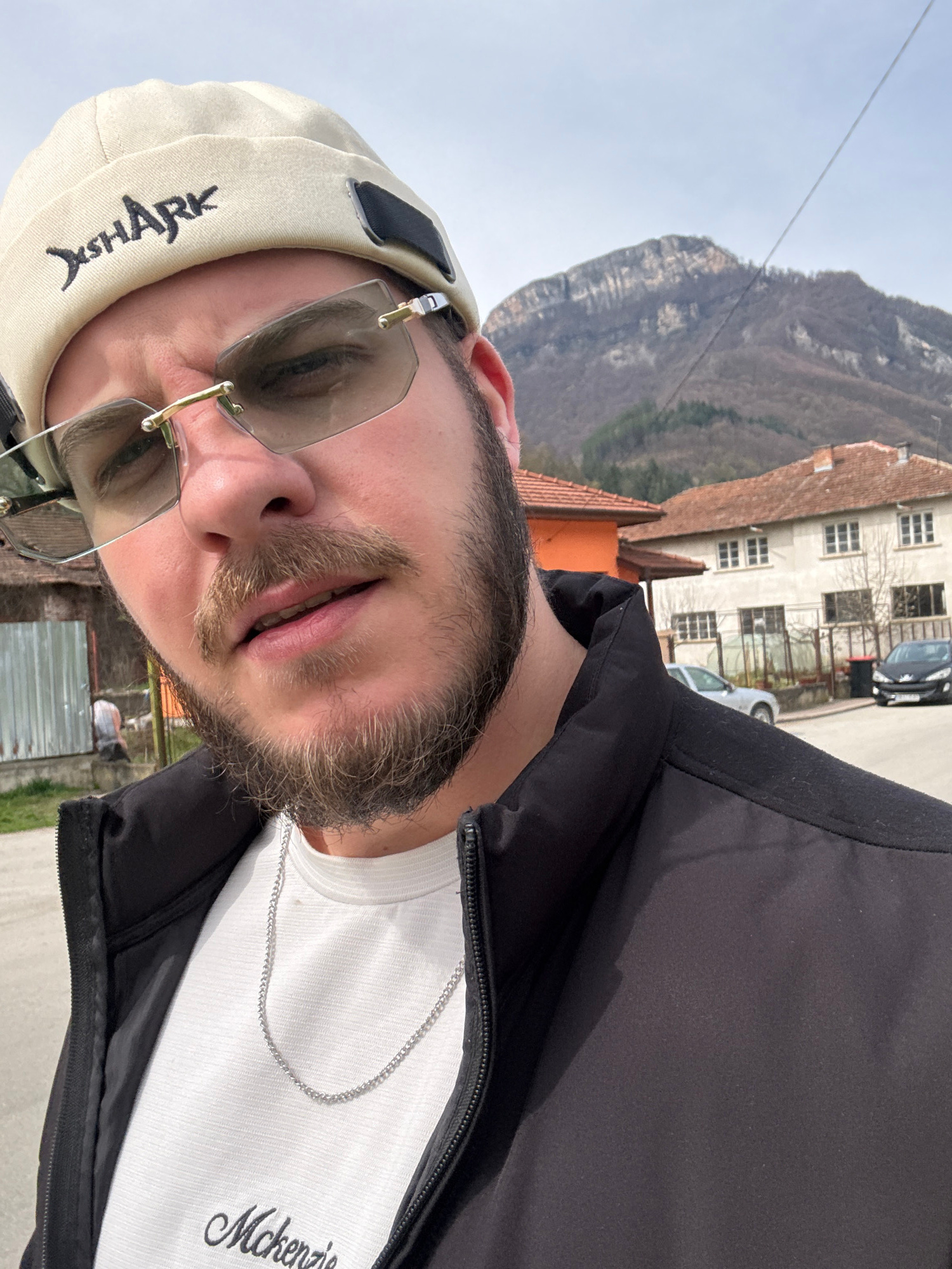 The image shows a selfie of a man wearing a cream-colored baseball cap with the word "Xshark" on it and aviator sunglasses. He is wearing a white shirt with the word "Mckenzie" written on it and a blaβ¦read more
