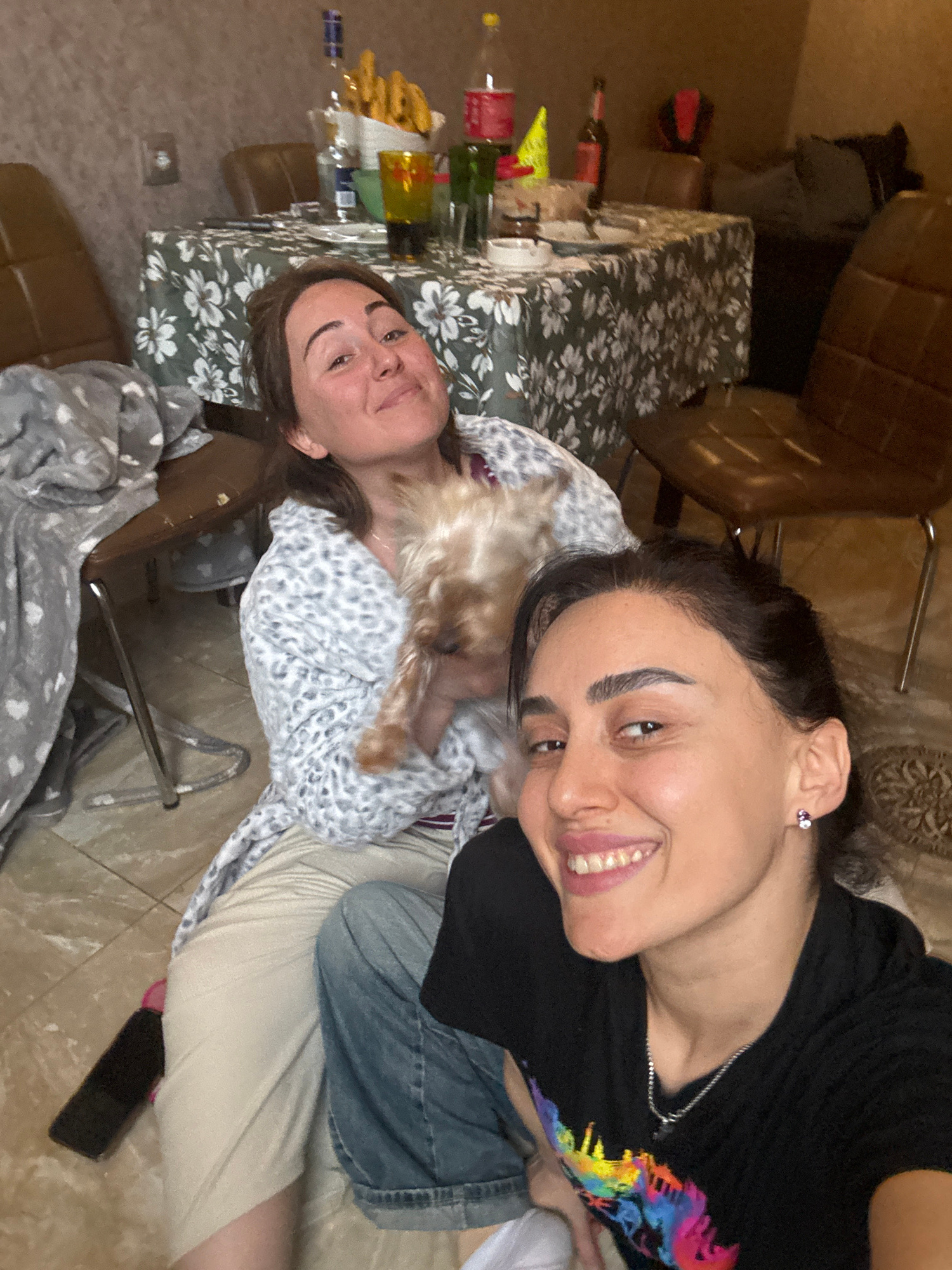Two women are posing indoors with a small dog. One woman is wearing a black t-shirt with a colorful design, jeans, and beige pants, while the other is wearing a light grey patterned top. The dog, with…read more