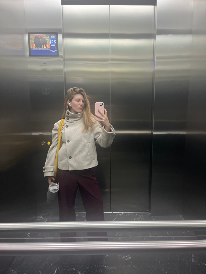 A woman takes a selfie in an elevator. She wears a light-colored coat, burgundy pants, and an earbud in her left ear. She holds a pink phone in her right hand and a to-go cup in her left. A yellow str…read more