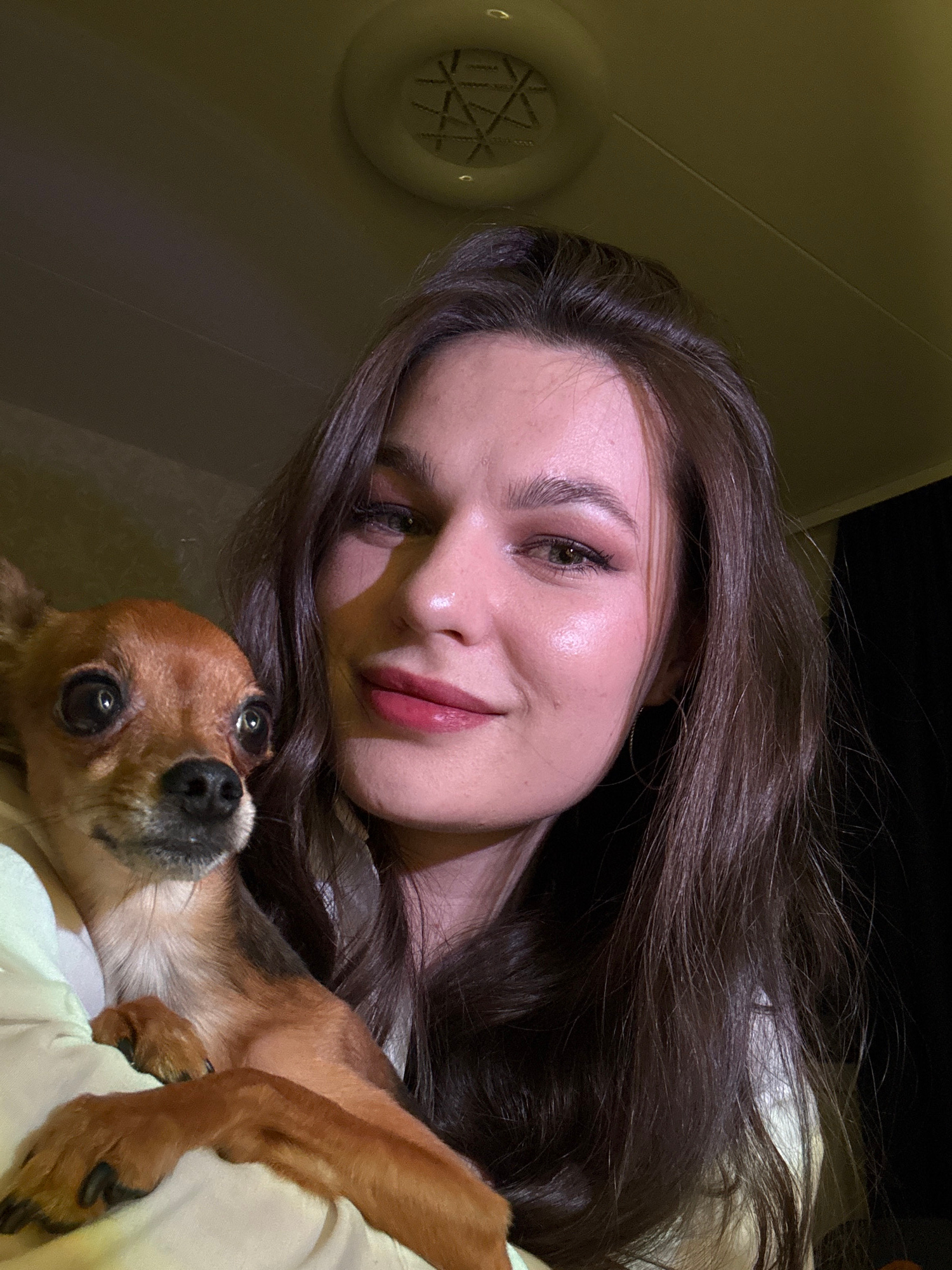 A woman with brown hair is posing with a small brown dog. The woman is fair-skinned and wearing makeup. The dog is resting on a white surface, possibly a bed or blanket. To the upper left is a white c…read more