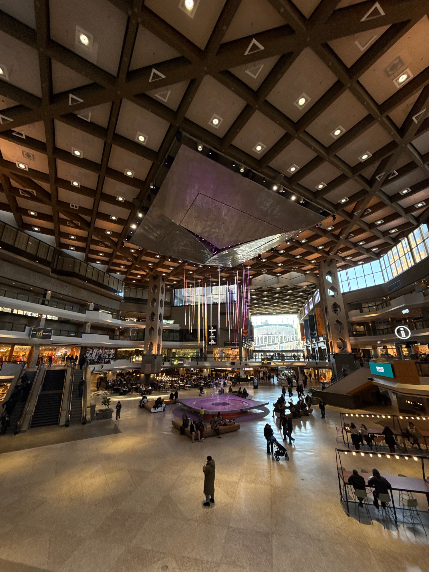 The image depicts the multi-level interior atrium, specifically the Grande-Place, of Complex Desjardins in Montreal, Canada. The scene is characterized by a distinctive coffered ceiling composed of da…read more
